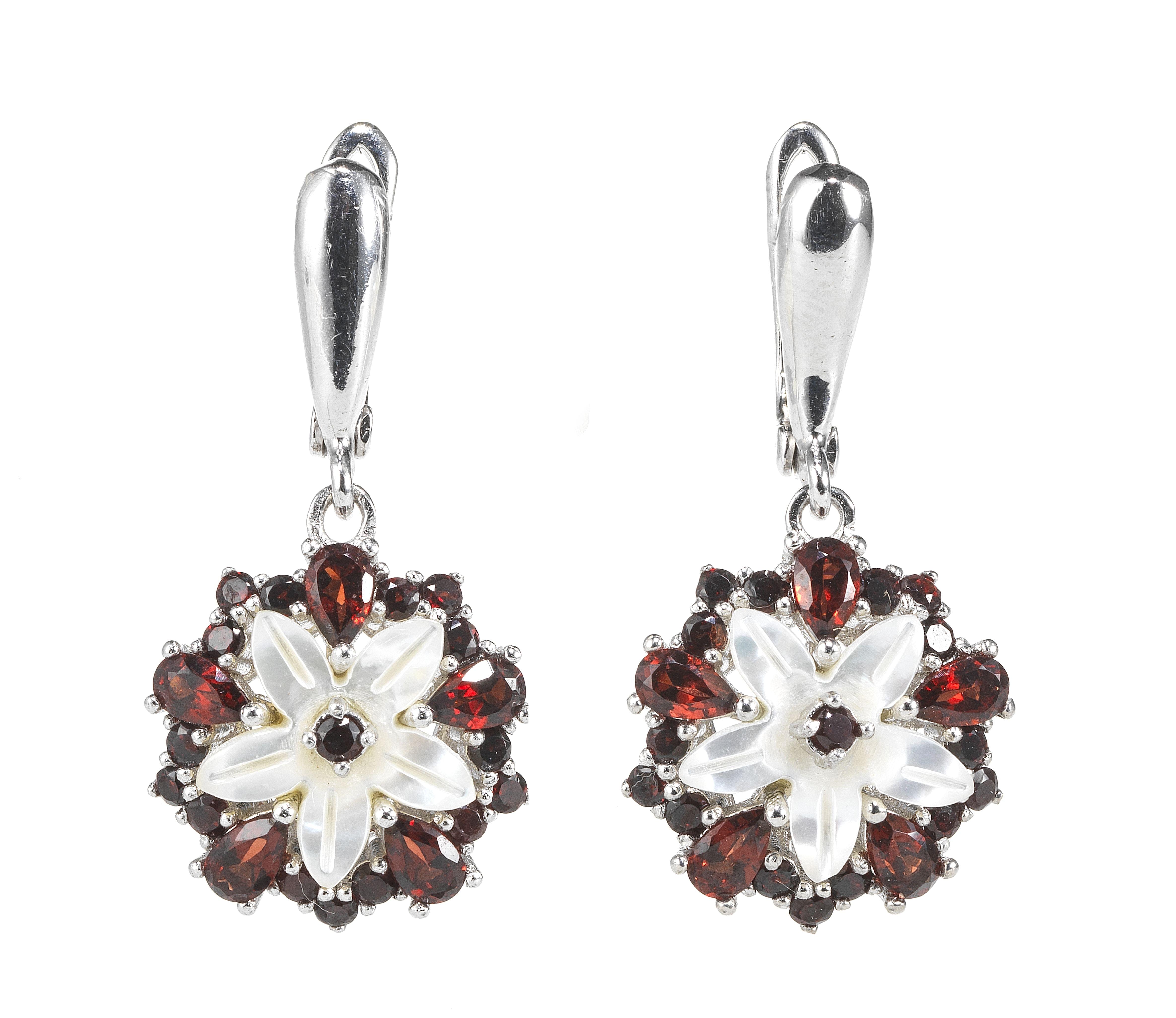 3031. *Pendants d'oreilles ornés de fleurs en nacre entourées de grenats taille poire et brillant