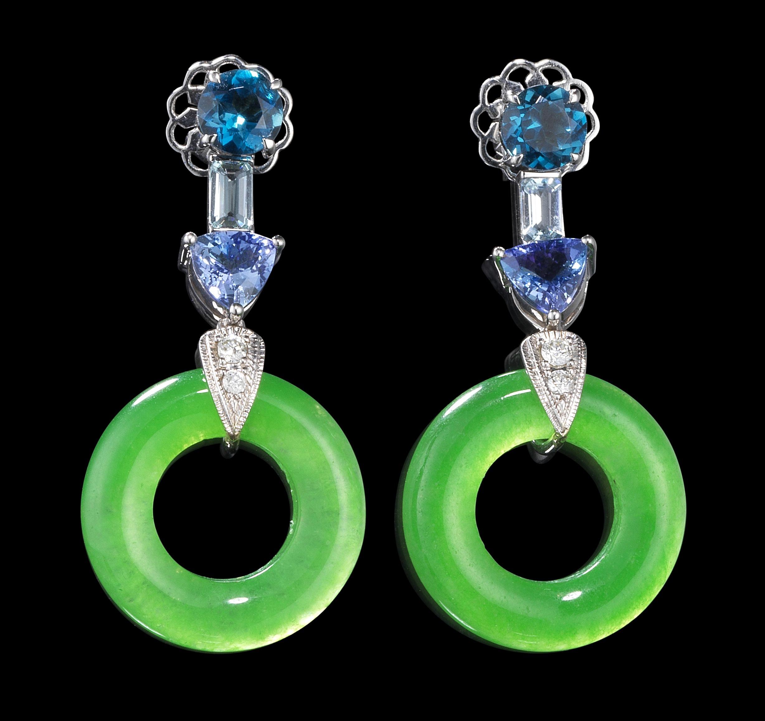 3366. *Pendants d'oreilles retenant chacun un disque de quartz vert rehaussés d'une tanzanite troïda (env. 1,5 ct), d'une topaze bleue (env. 2