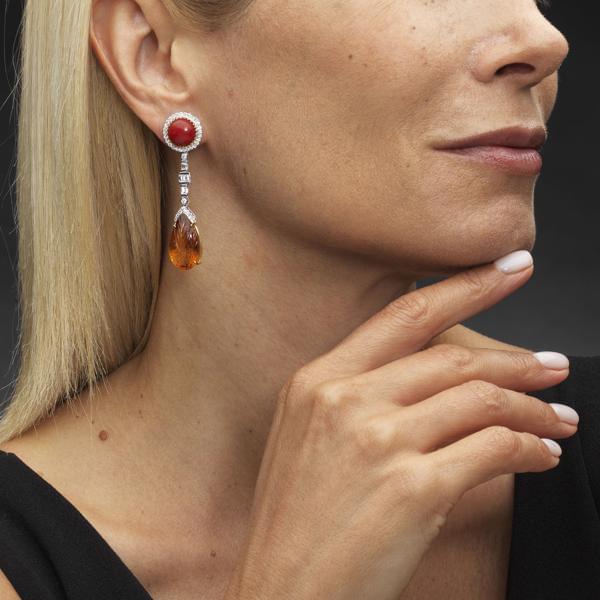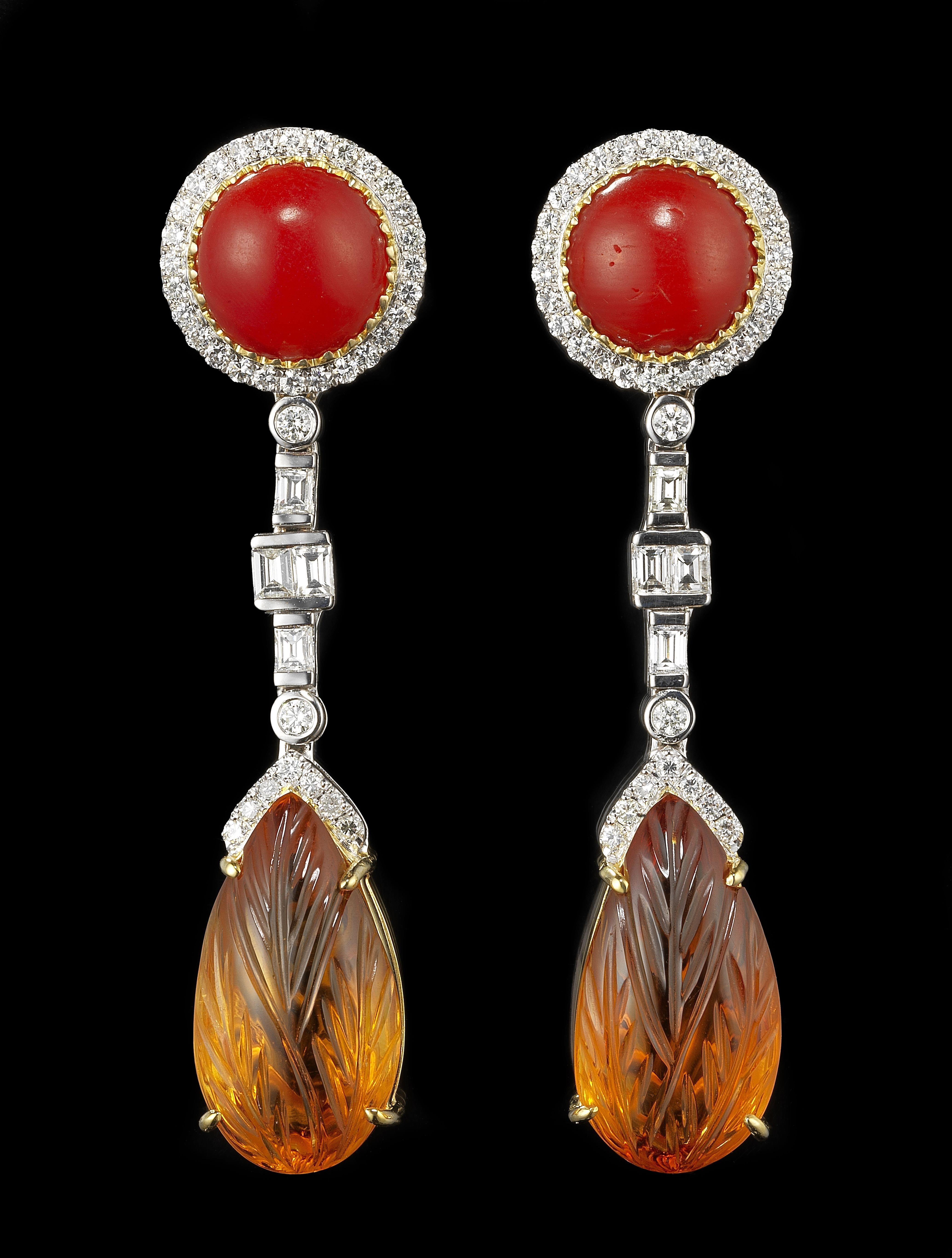 81. *Pendants d'oreilles retenant chacun une citrine sculptée à motif de feuille (total 17,53 ct) rehaussée d'une ligne de diamants et d'un