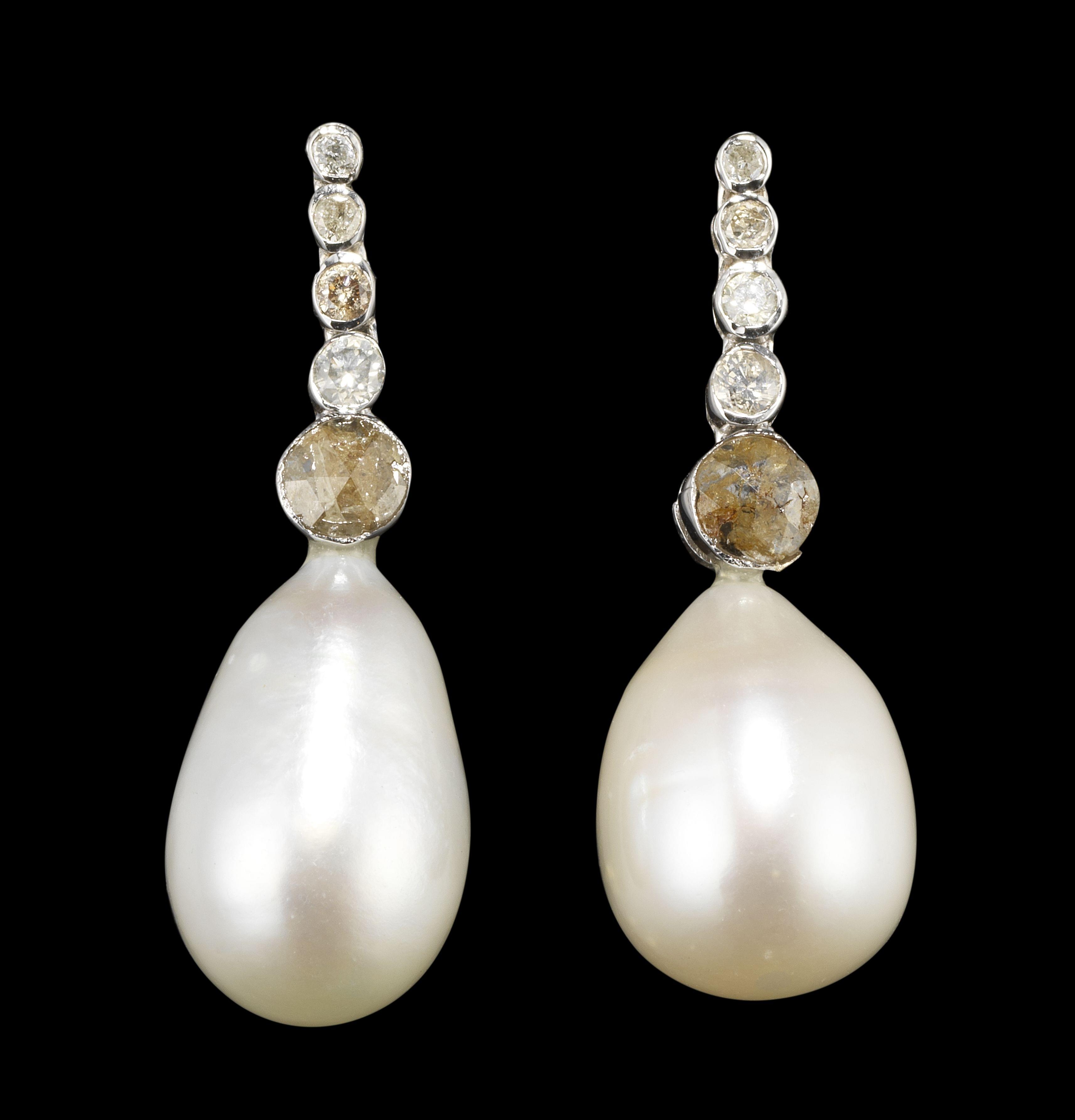 3346. *Pendants d'oreilles retenant chacun une perle en goutte (D env. 10 mm)