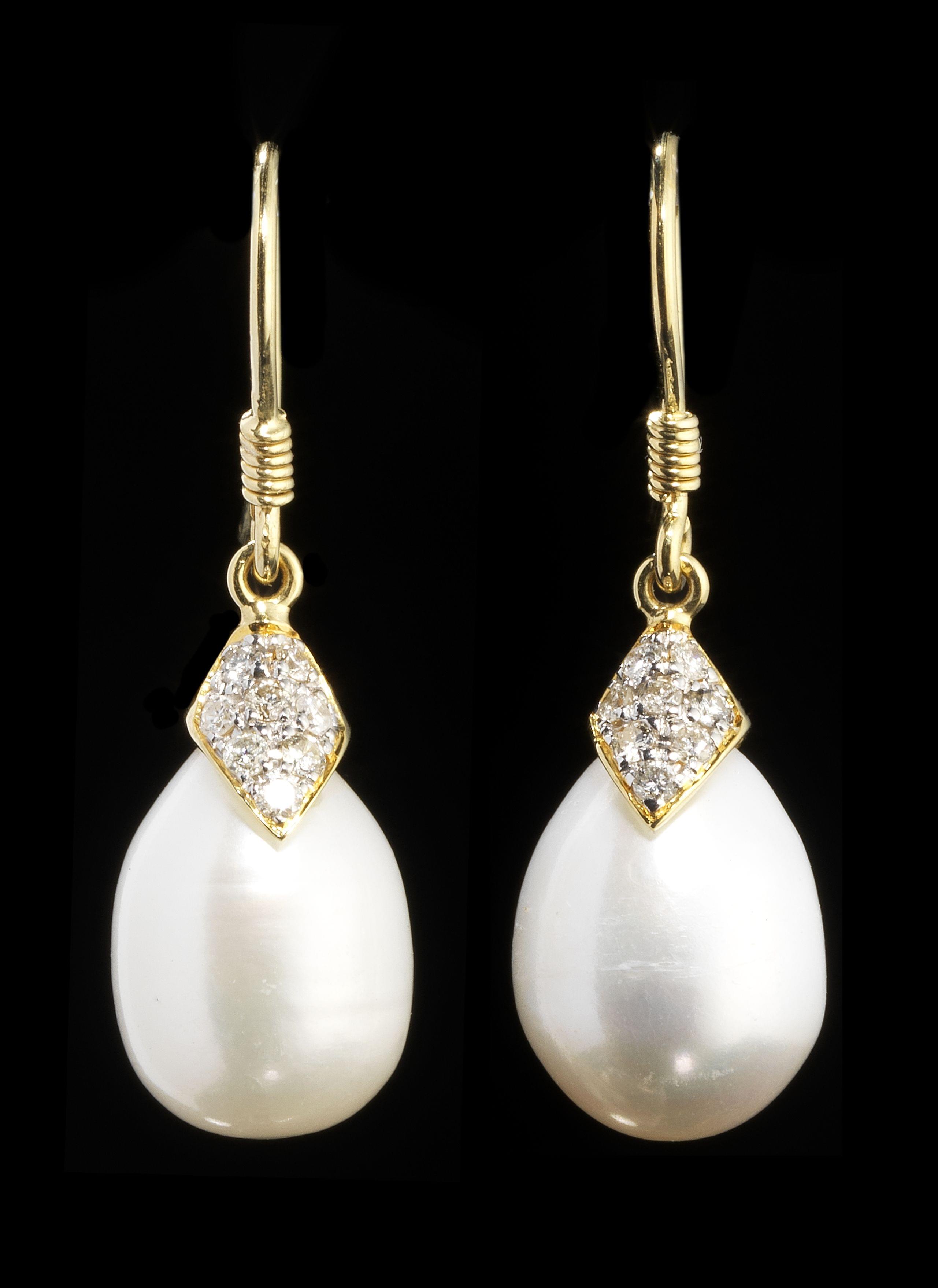 3306. *Pendants d'oreilles retenant chacun une perle en goutte (D env. 10 mm) rehaussée d'un pavage de diamants