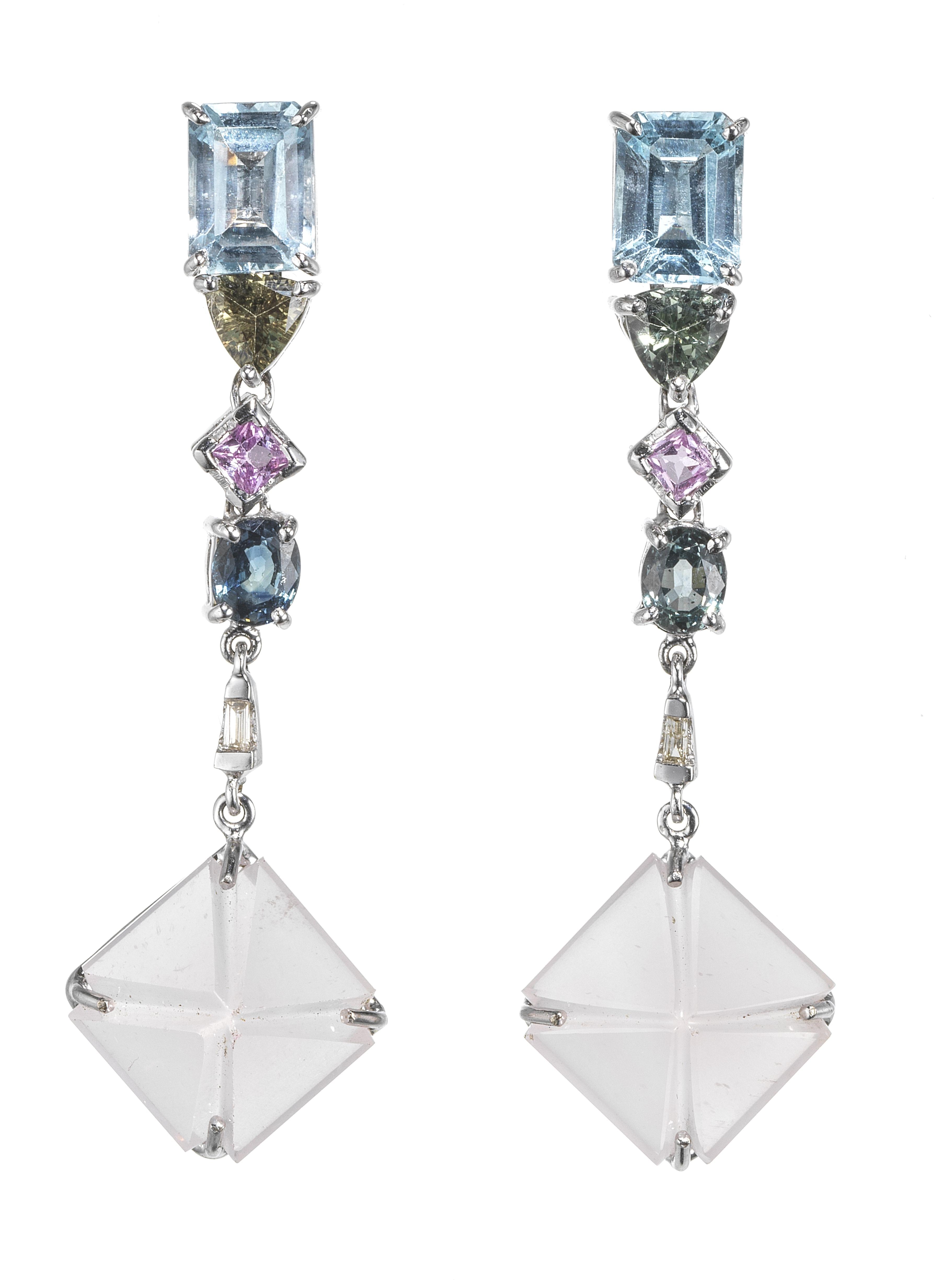 3422. *Pendants d'oreilles retenant des quartz roses taille fantaisie
