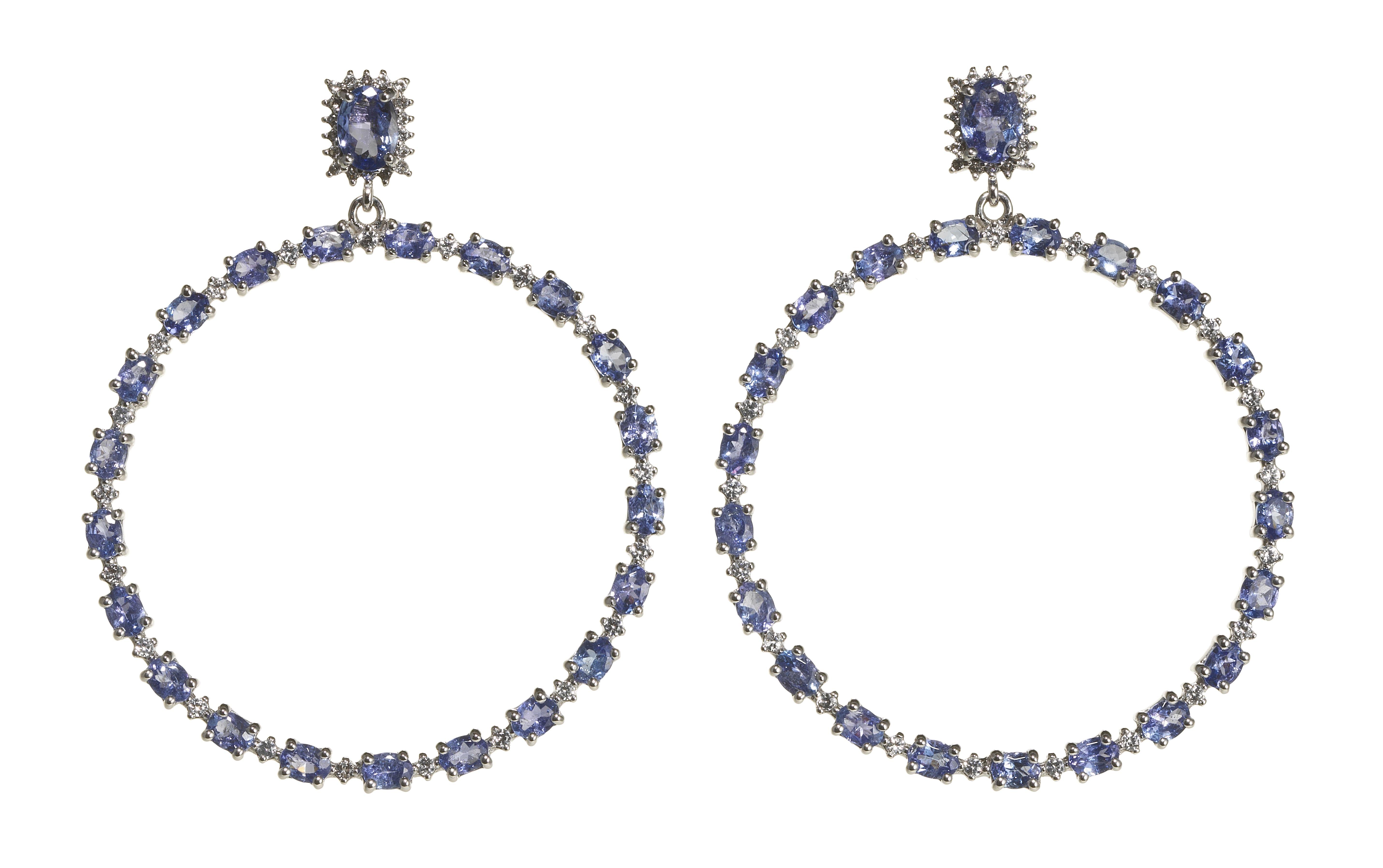 3344. *Pendants d'oreilles retenant un motif circulaire serti de tanzanites taille ovale rehaussées de topazes blanches