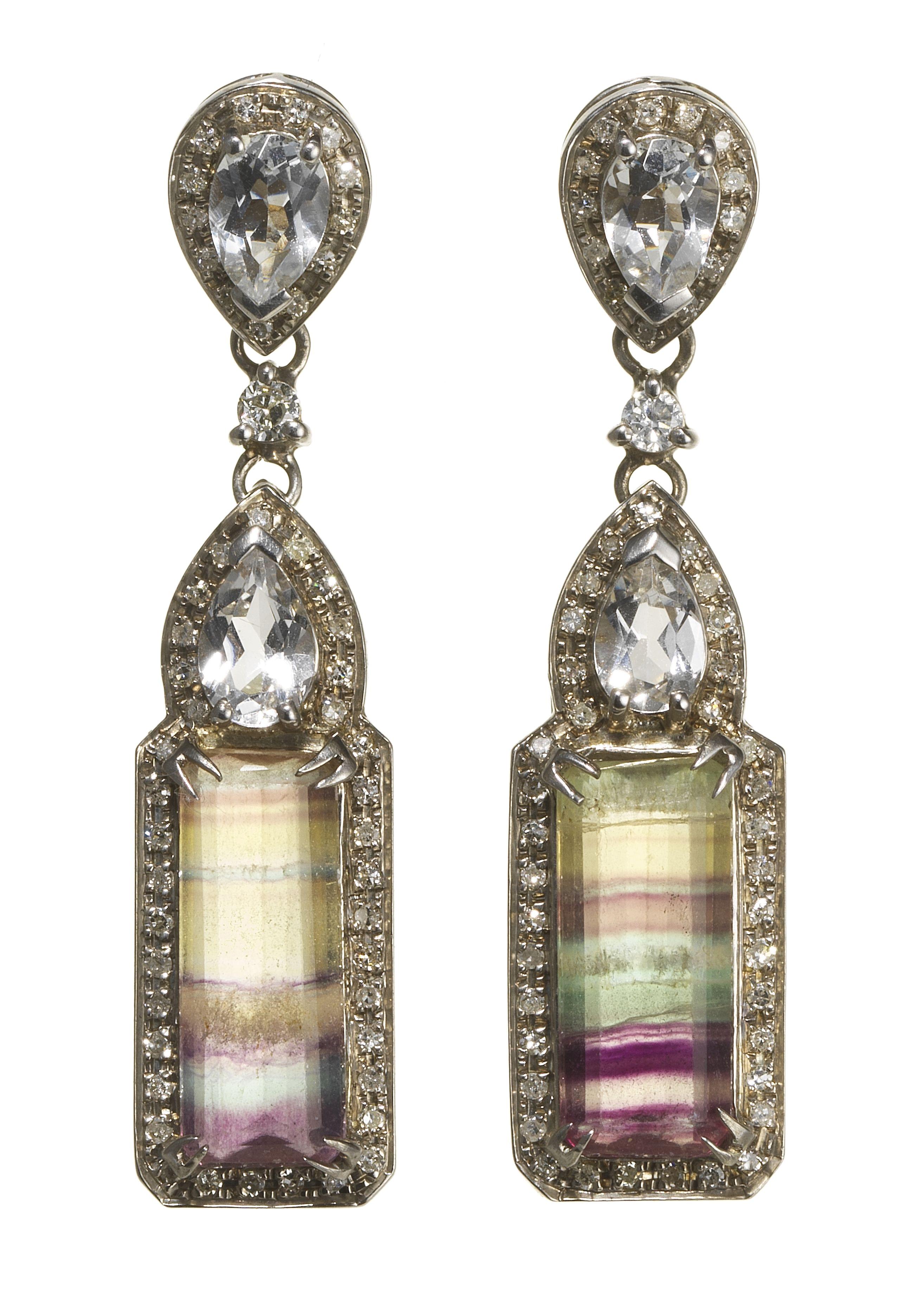 3260. *Pendants d'oreilles retenant une fluorite polychrome taille rectangle rehaussée de topazes blanches et entourées de diamants