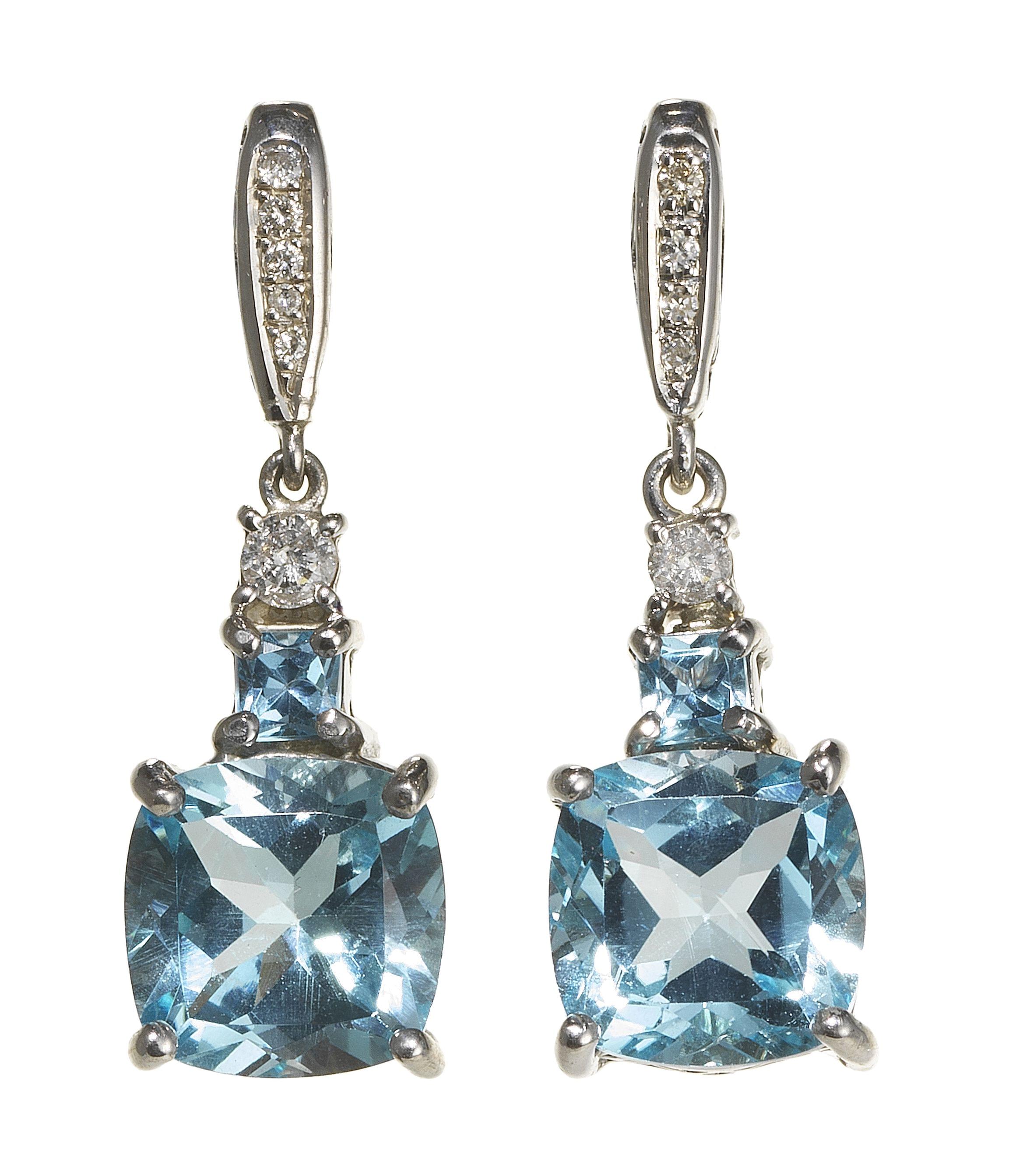 3100. *Pendants d'oreilles retenant une topaze bleue taille coussin rehaussée d'une topaze bleue et de diamants