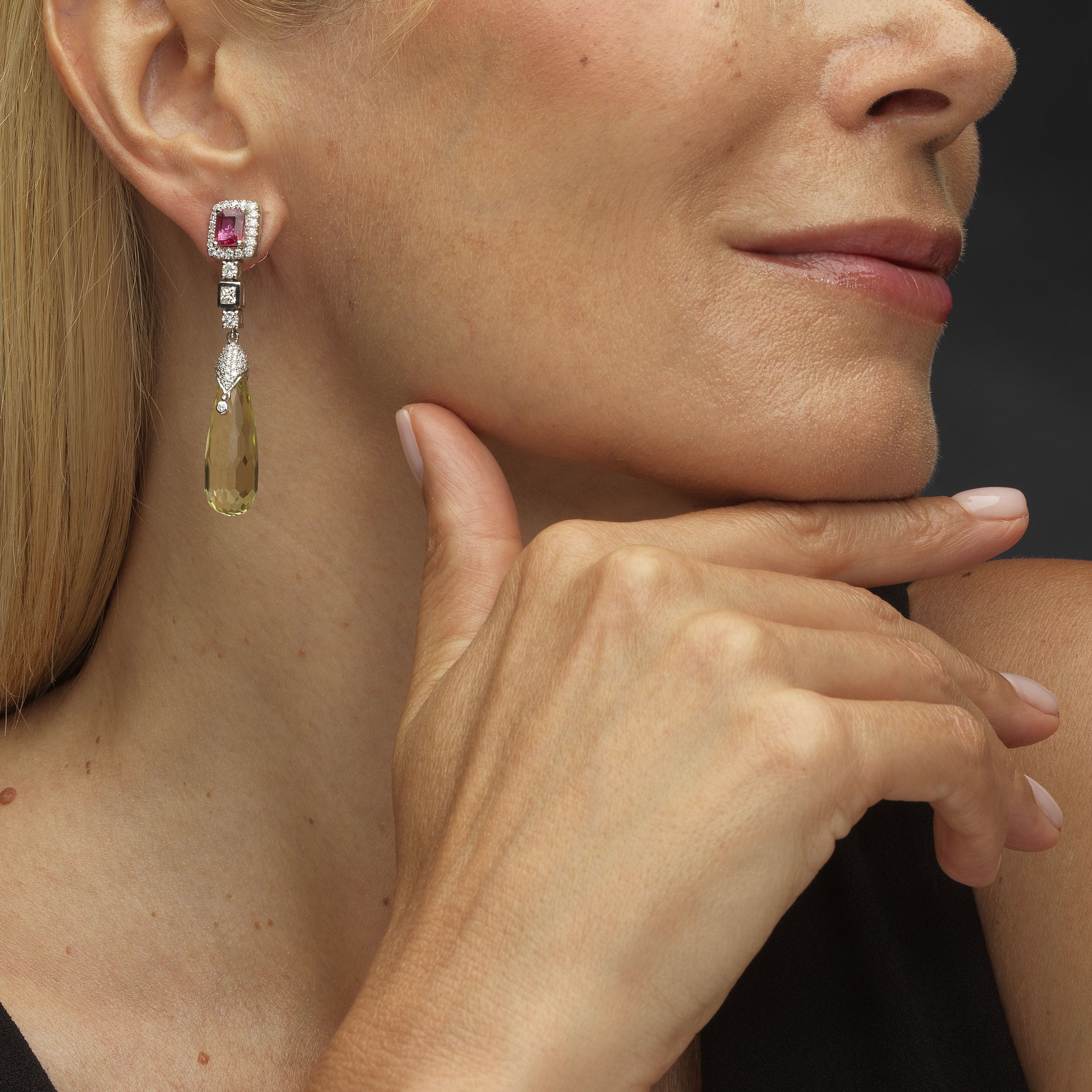 Dans un entourage de diamants et retenant une goutte de citrine en briolette, or gris 750, H 5 cm, poids brut 14 g, accompagnés d'un certificat GFCO daté d'octobre 2021. Pour les lots précédés d'un *, la TVA de 8,1% est due sur l'entier du prix d'adjudication.