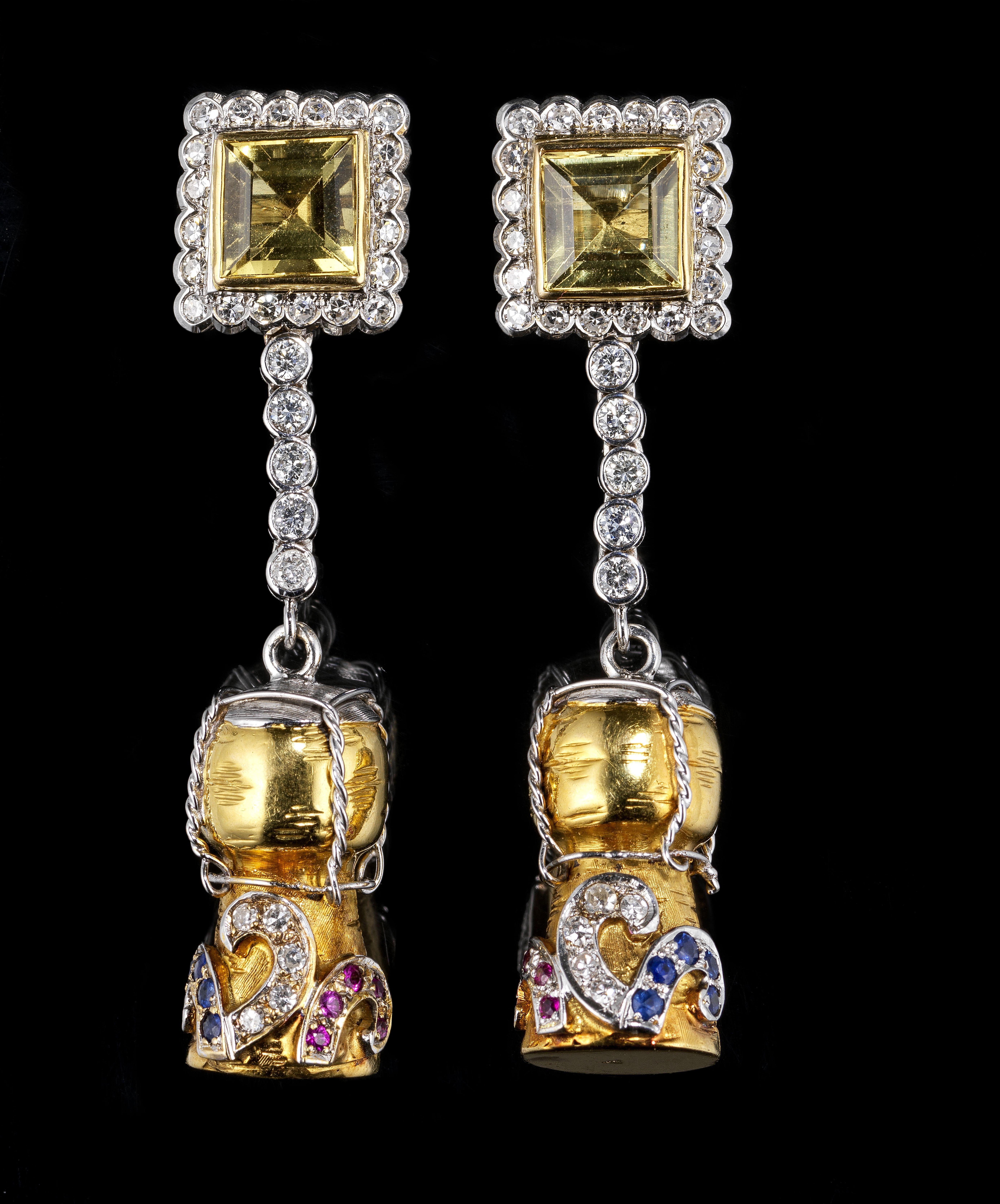 Retenant des bouchons de champagne sertis de rubis, de saphirs et de diamants, or et or gris 750, H 5 cm, 19 g. Pour les lots précédés d'un *, la TVA de 7,7% est due sur l'entier du prix d'adjudication.