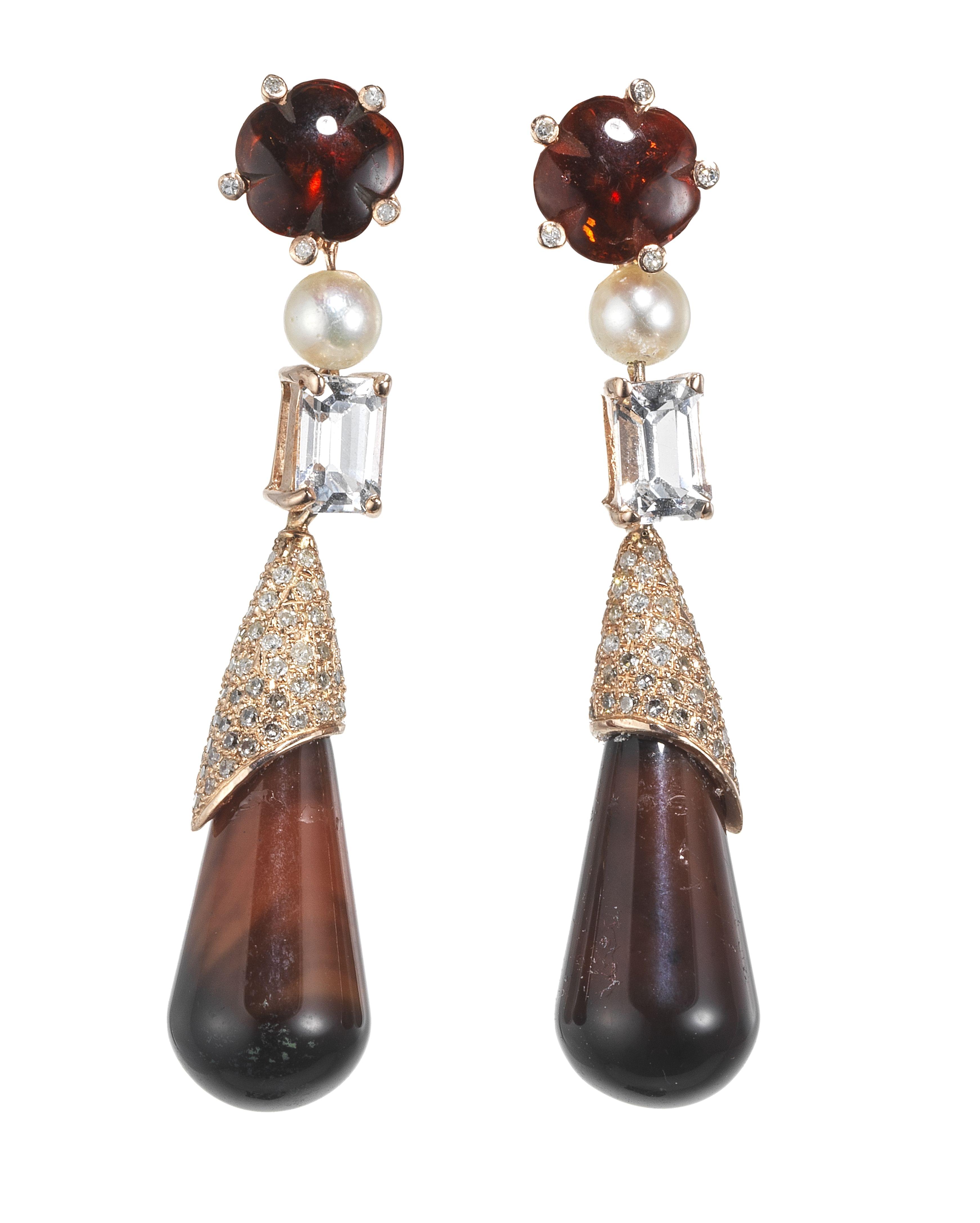 3296. *Pendants d'oreilles sertis de gouttes d'œil de taureau rehaussées d'un grenat, d'une perle et d'une topaze