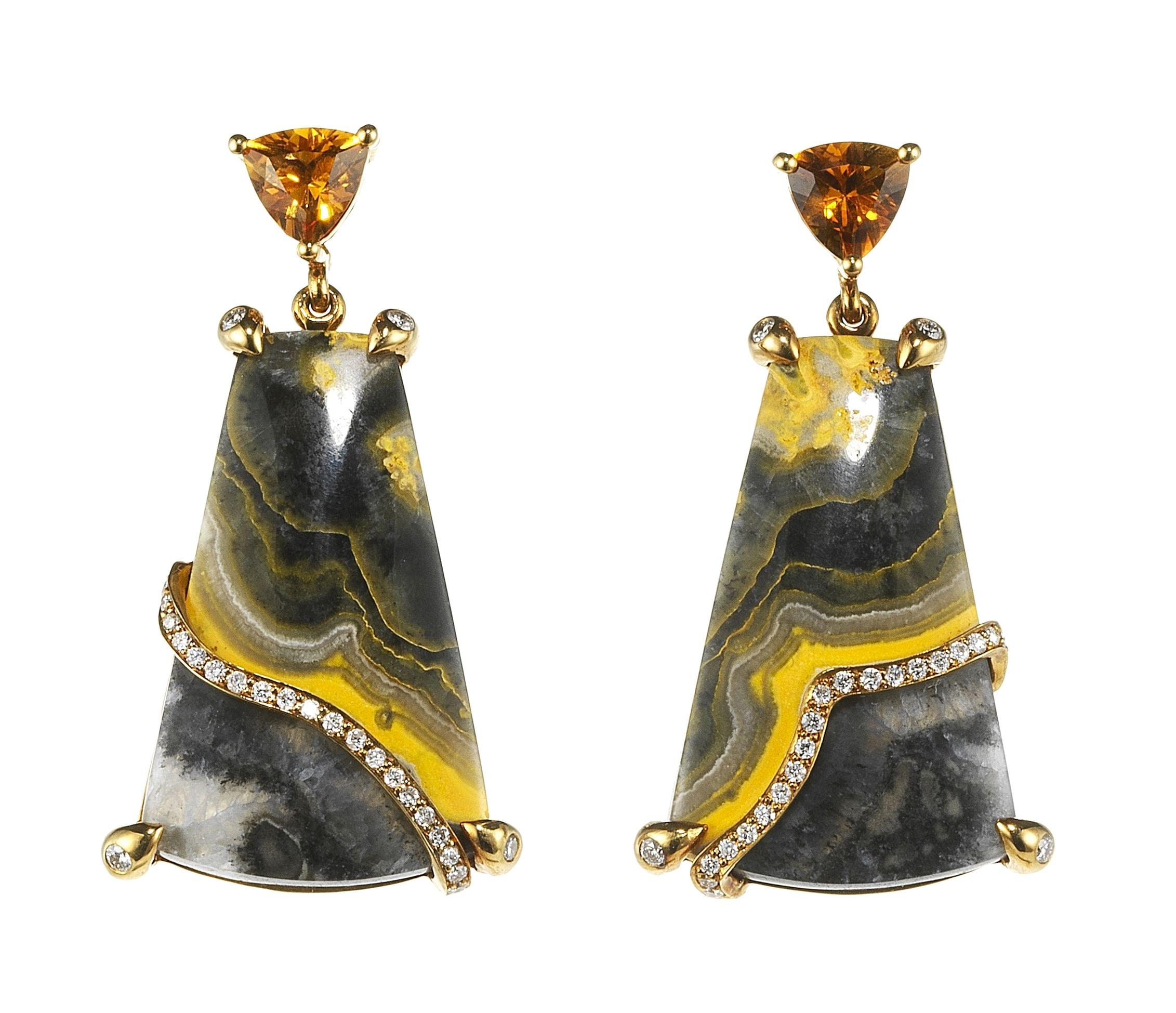 3252. *Pendants d'oreilles sertis de jaspes surmontés chacun d'une citrine taille troïda et rehaussés d'une ligne de diamants