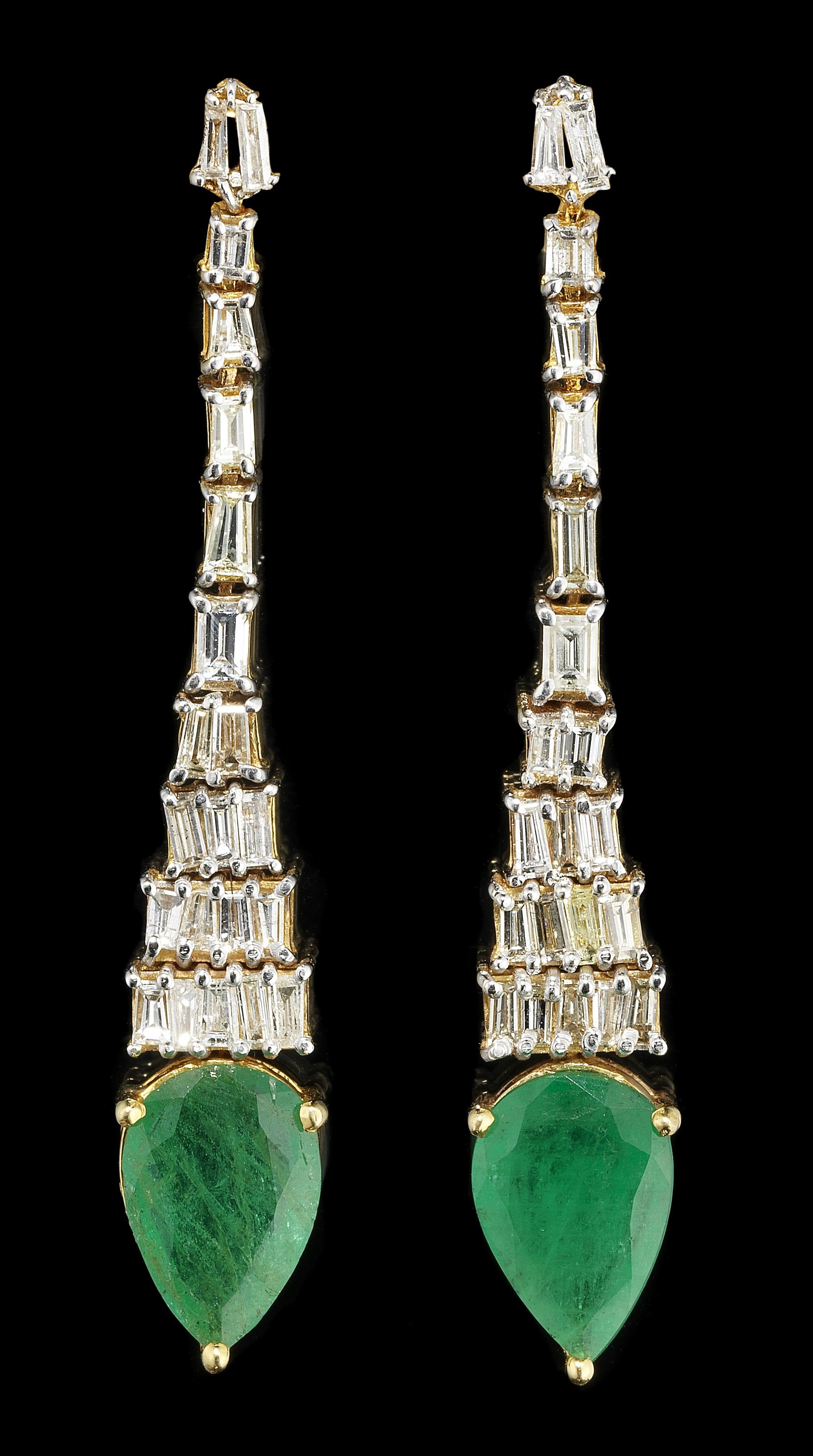 3380. *Pendants d'oreilles souples retenant chacun une émeraude taille poire (env. 4 ct) rehaussée de diamants taille baguette