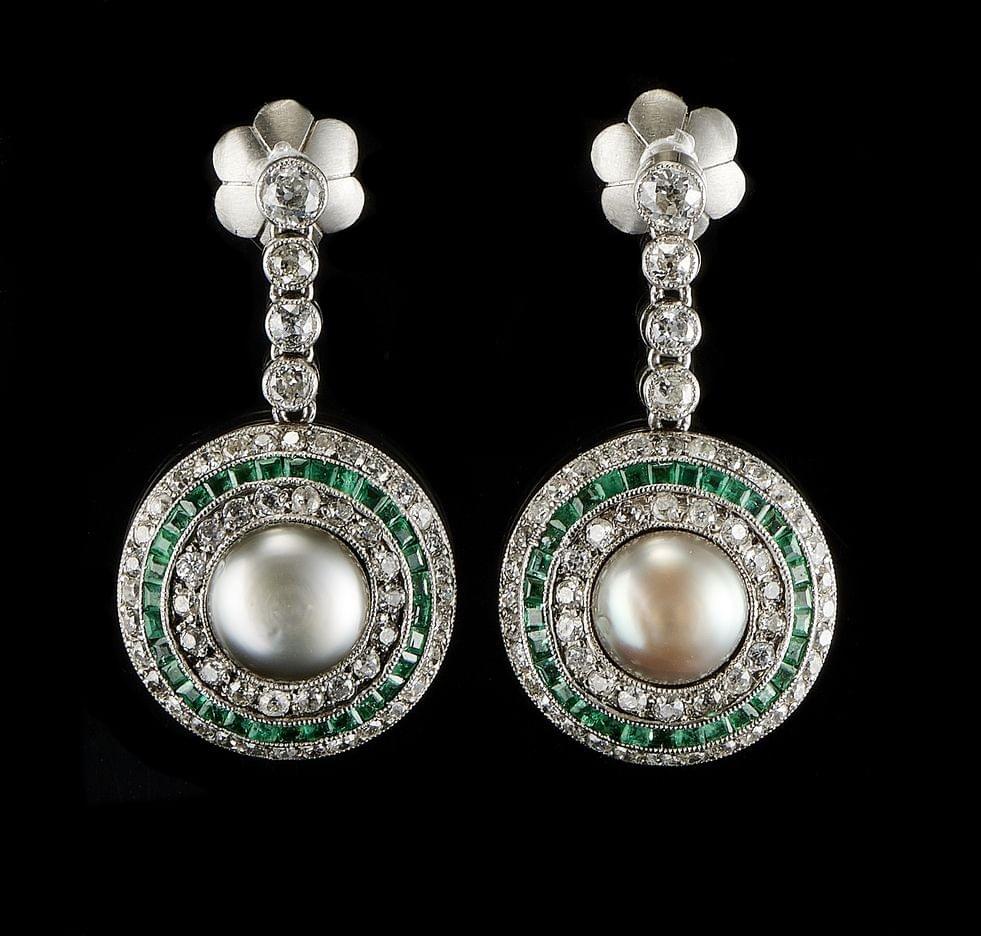 107. Pendants d'oreilles Art déco retenant un motif centré d'une perle fine grise entourée de diamants taille ancienne et d'émeraudes calibrées