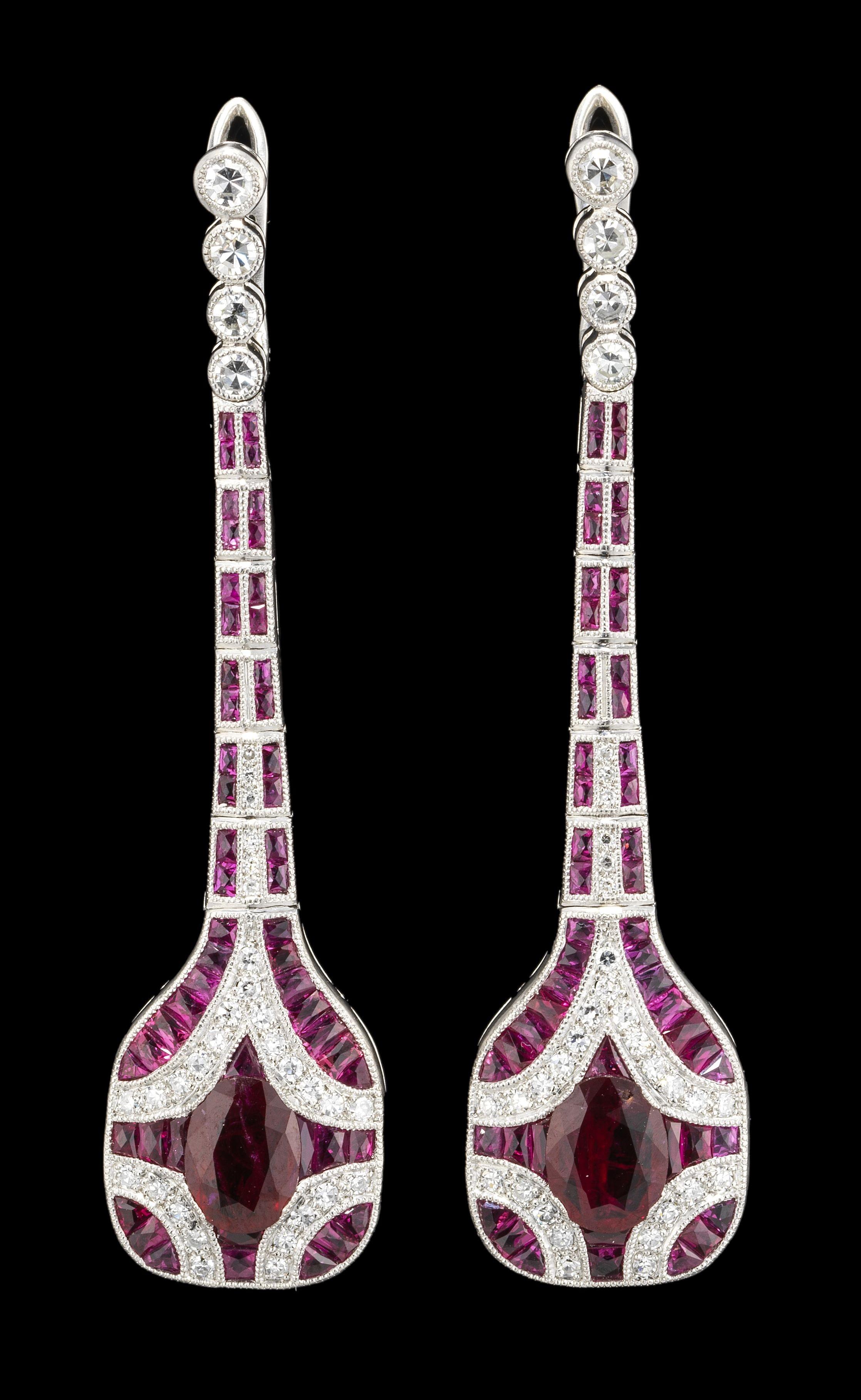 Sertis de rubis taille ovale (env. 1,4 ct) entourés de rubis calibrés et de lignes de diamants (env. 0,8 ct), platine 900, H 6 cm, 14 g. Pour les lots précédés d’un *, la TVA de 7.7% est due sur l’entier du prix d’adjudication.