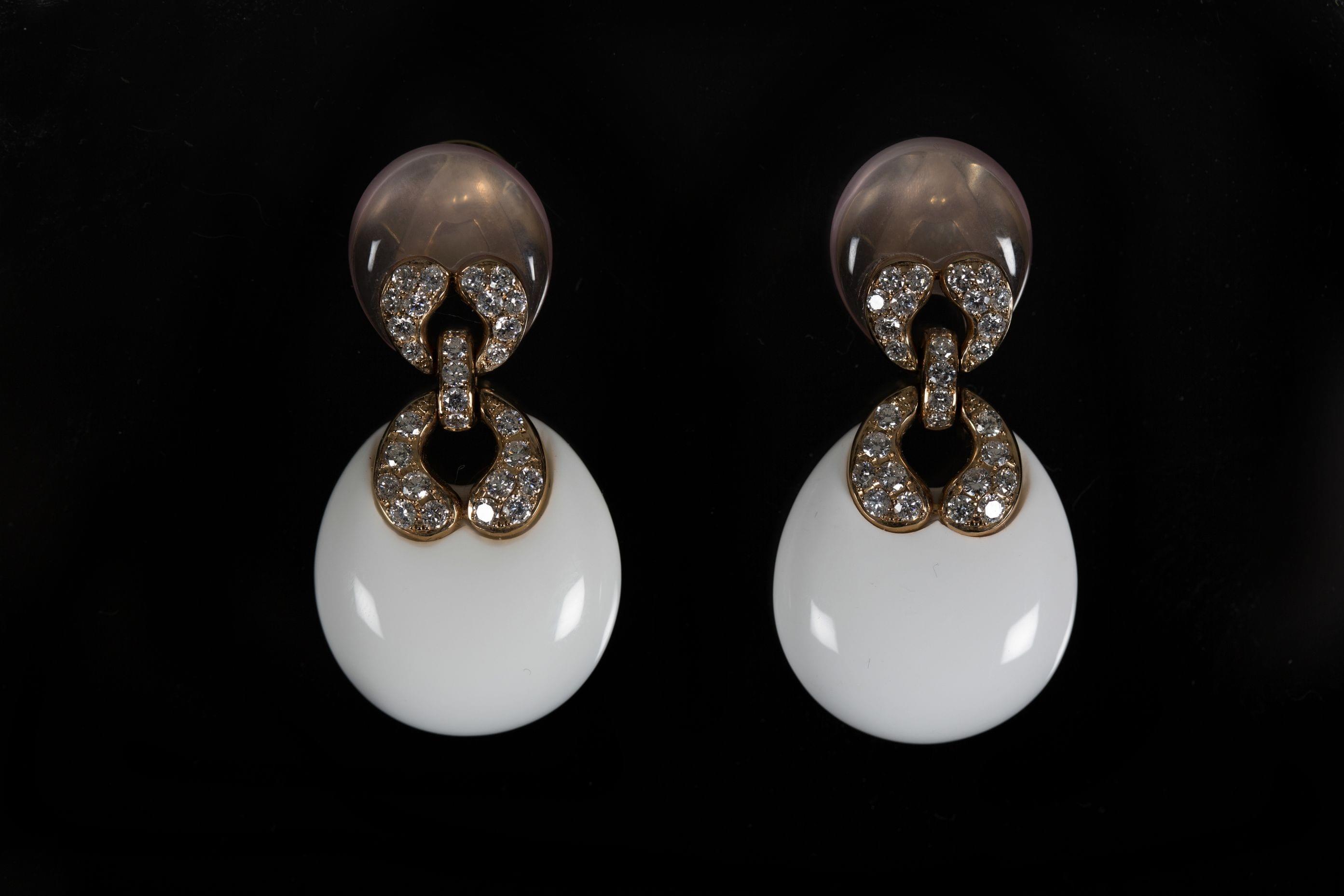 814. Pendants d'oreilles sertis de calcédoine blanche rehaussée de quartz rose et de diamants (env. 0,8 ct)