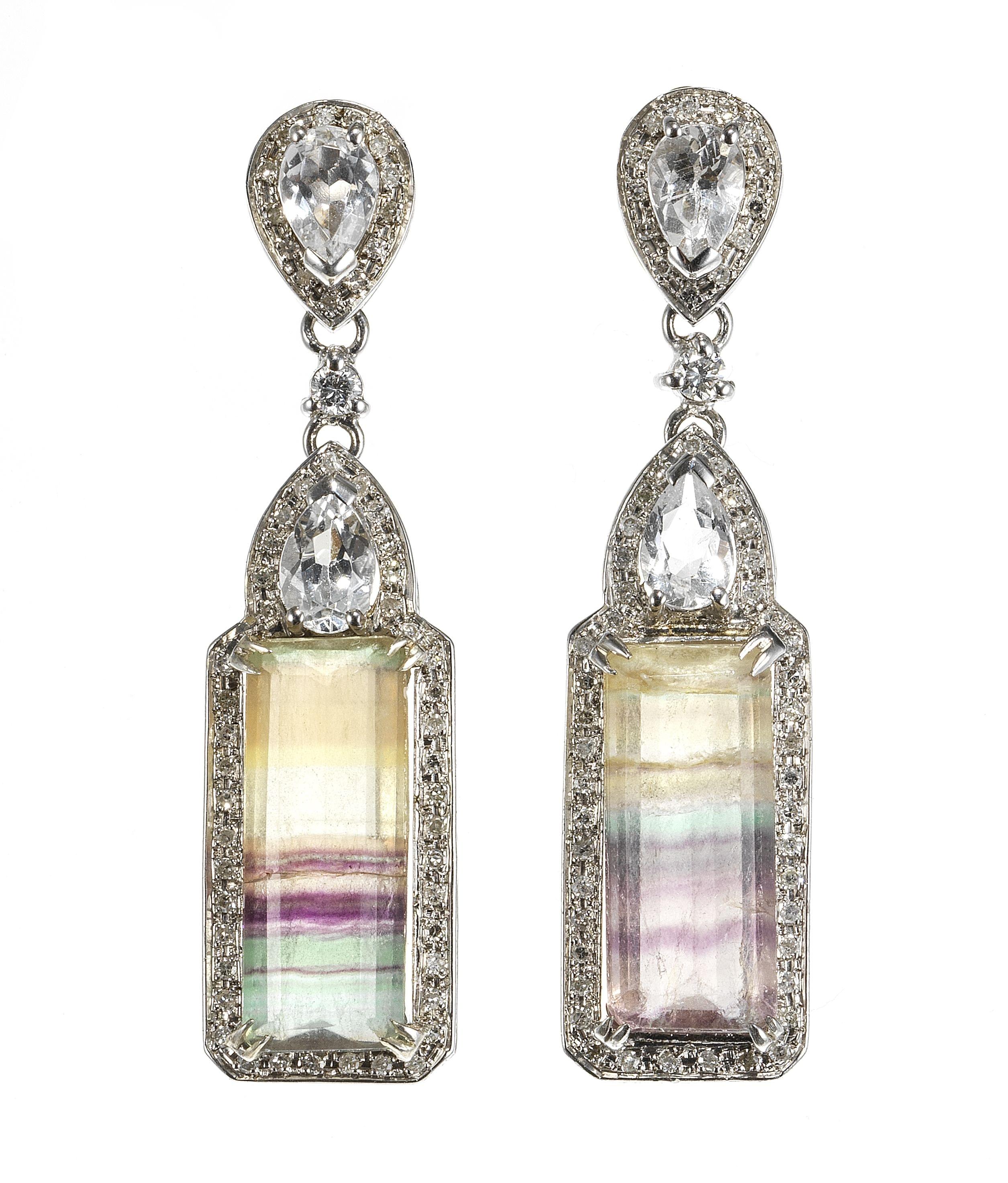 3274. *Pendants d'oreilles sertis de fluorites taille rectangle rehaussées de topazes taille poire et entourées de diamants