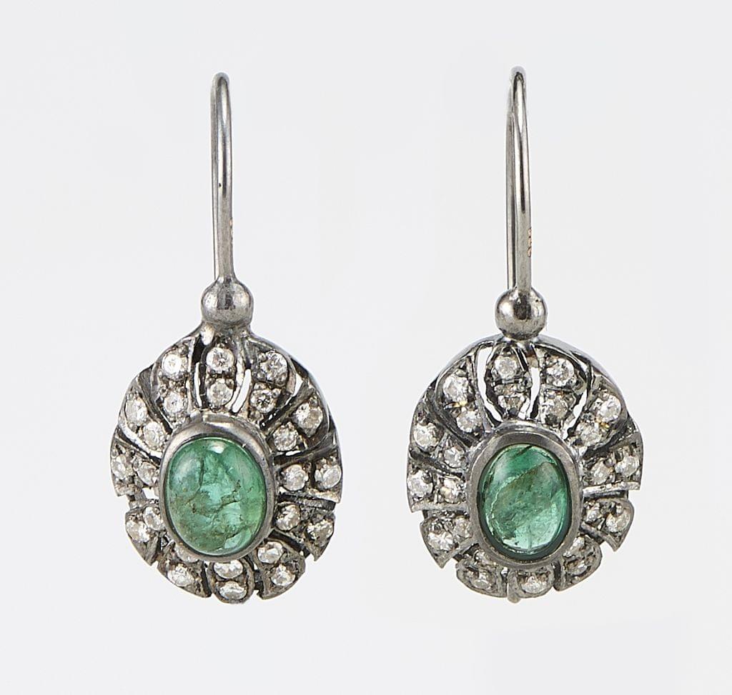 3415. *Pendants d'oreilles sertis d'émeraudes taille cabochon ovale (env. 1 ct) entourés de diamants
