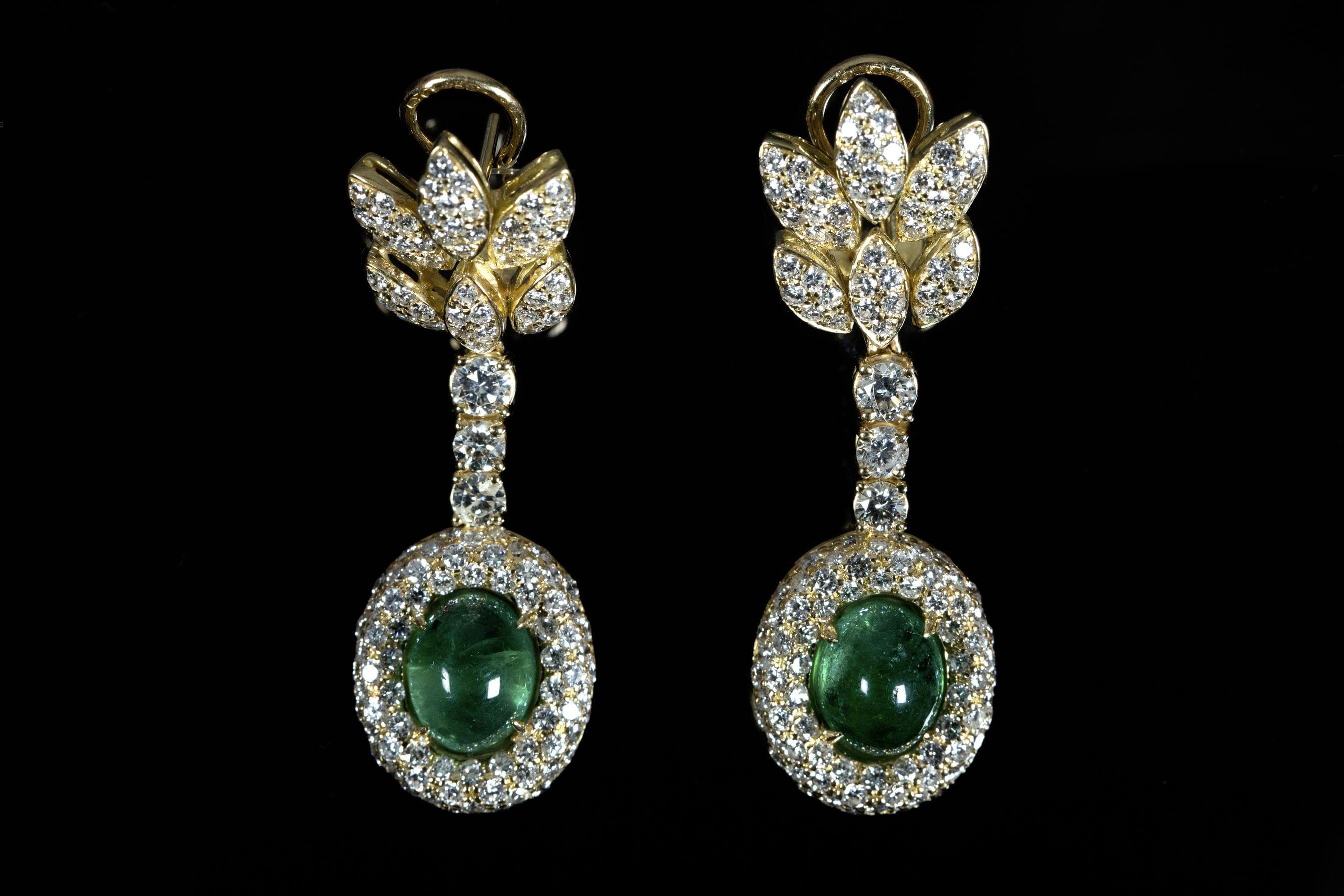 828. Pendants d'oreilles sertis d'émeraudes taille cabochon (env. 5 ct) et pavés de diamants (env. 3 ct)