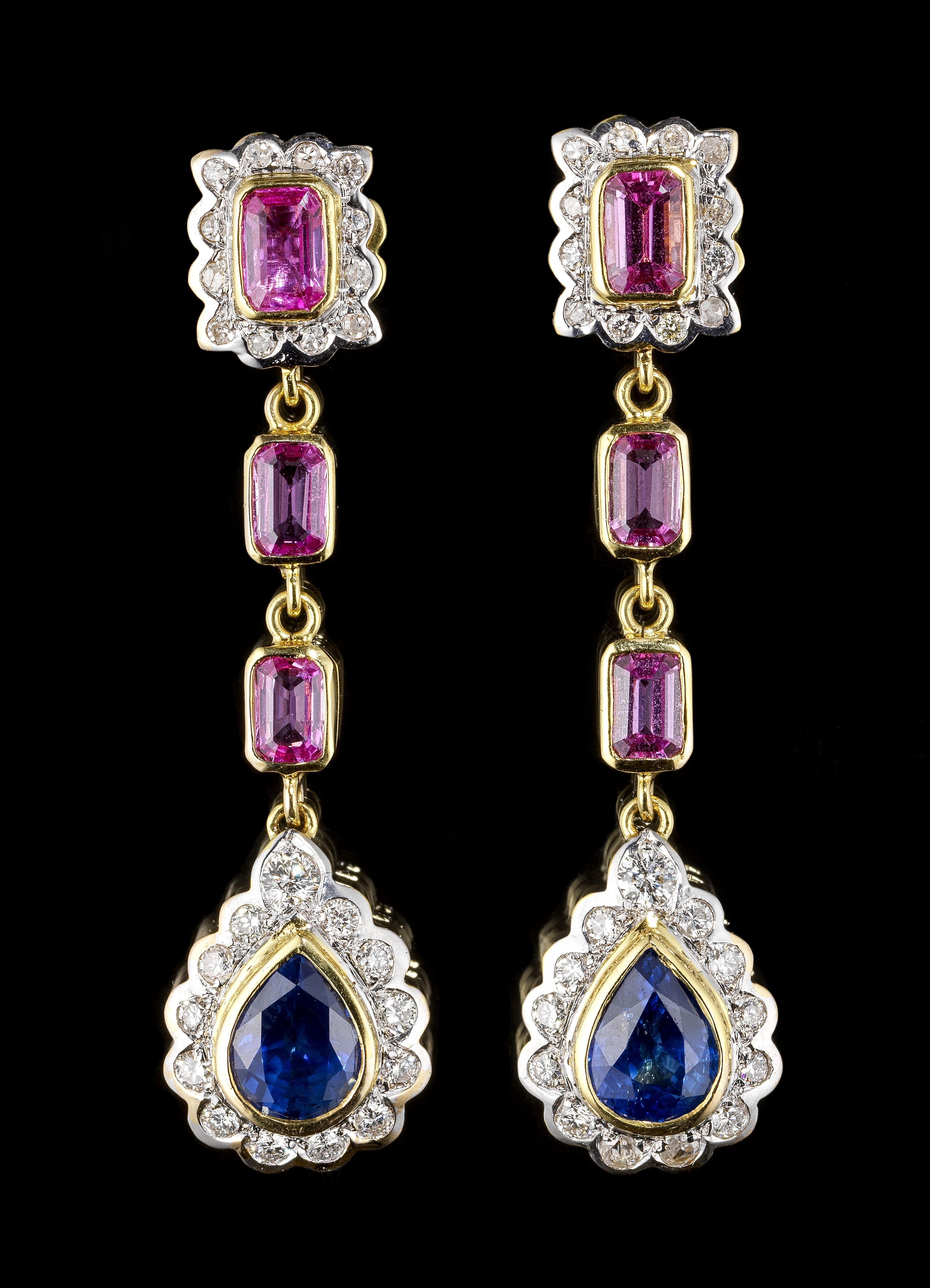 42. *Pendants d'oreilles sertis d'une ligne de saphirs roses taille émeraude (total 2,6 ct)
