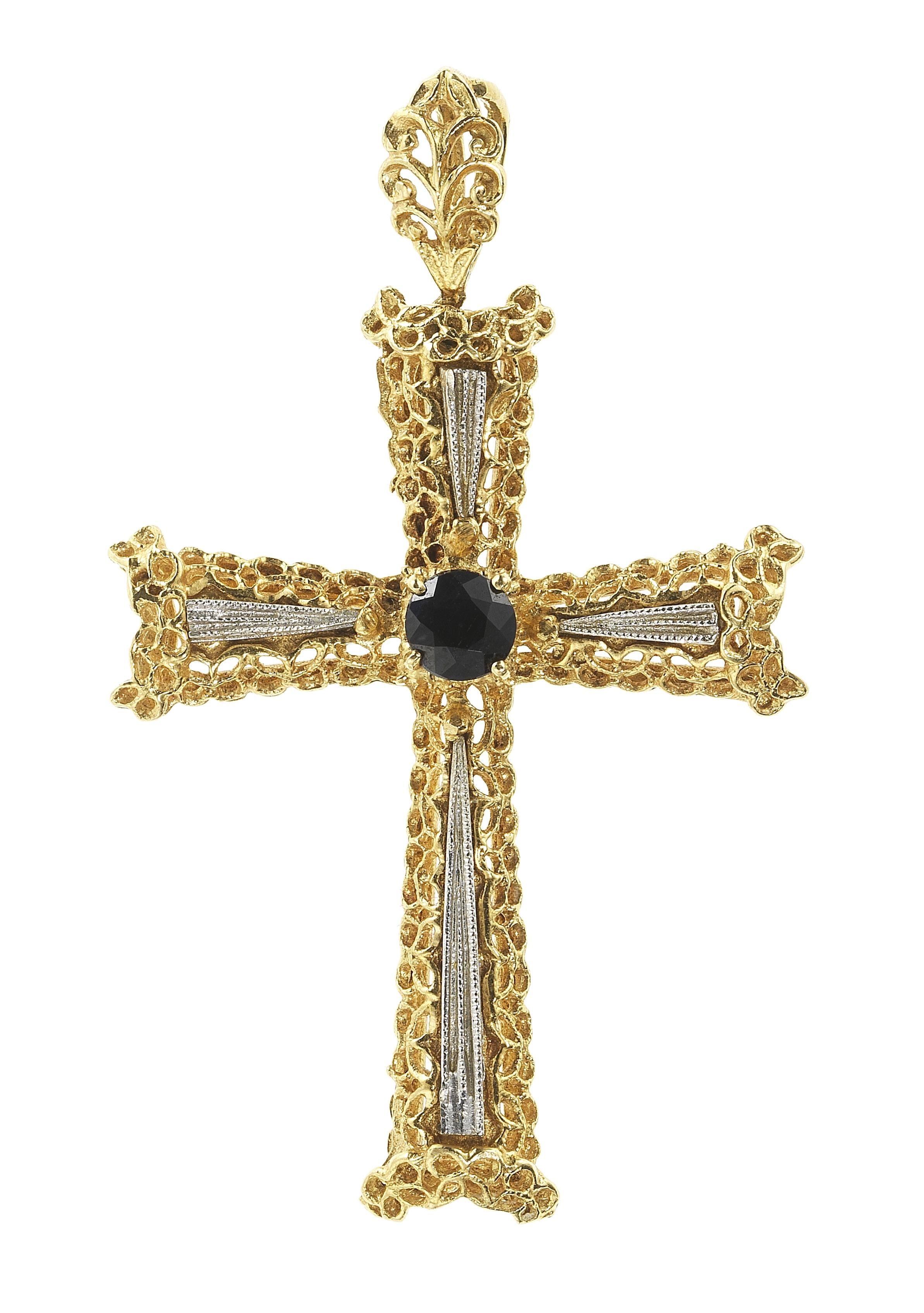3202. *Pendentif à motif de croix ajourée centrée d'un saphir taille brillant
