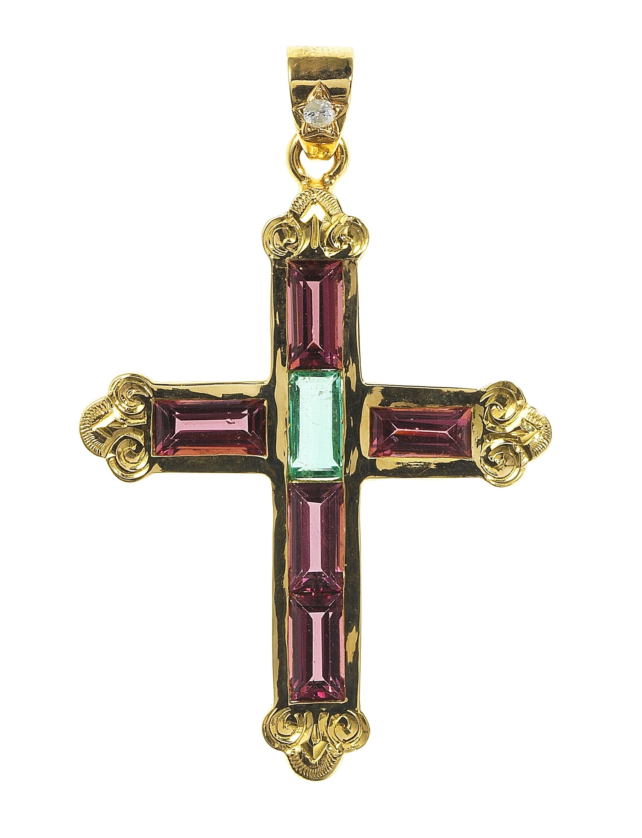 3203. *Pendentif à motif de croix sertie d'une émeraude taille baguette et de rhodolite surmontées d'un petit diamant