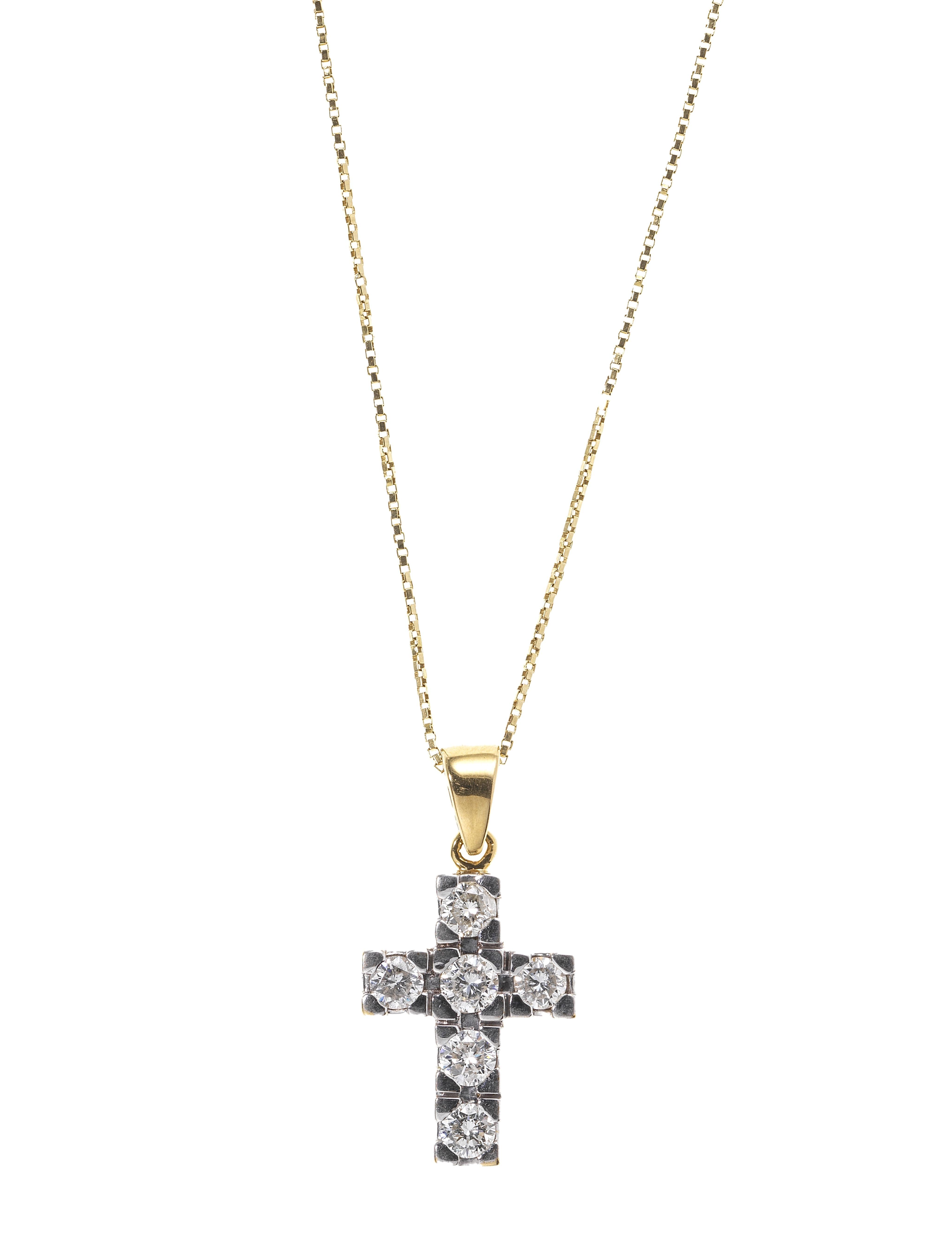 3369. Pendentif à motif de croix sertie de diamants (env. 1,5 ct) retenu par une chaîne à maille vénitienne