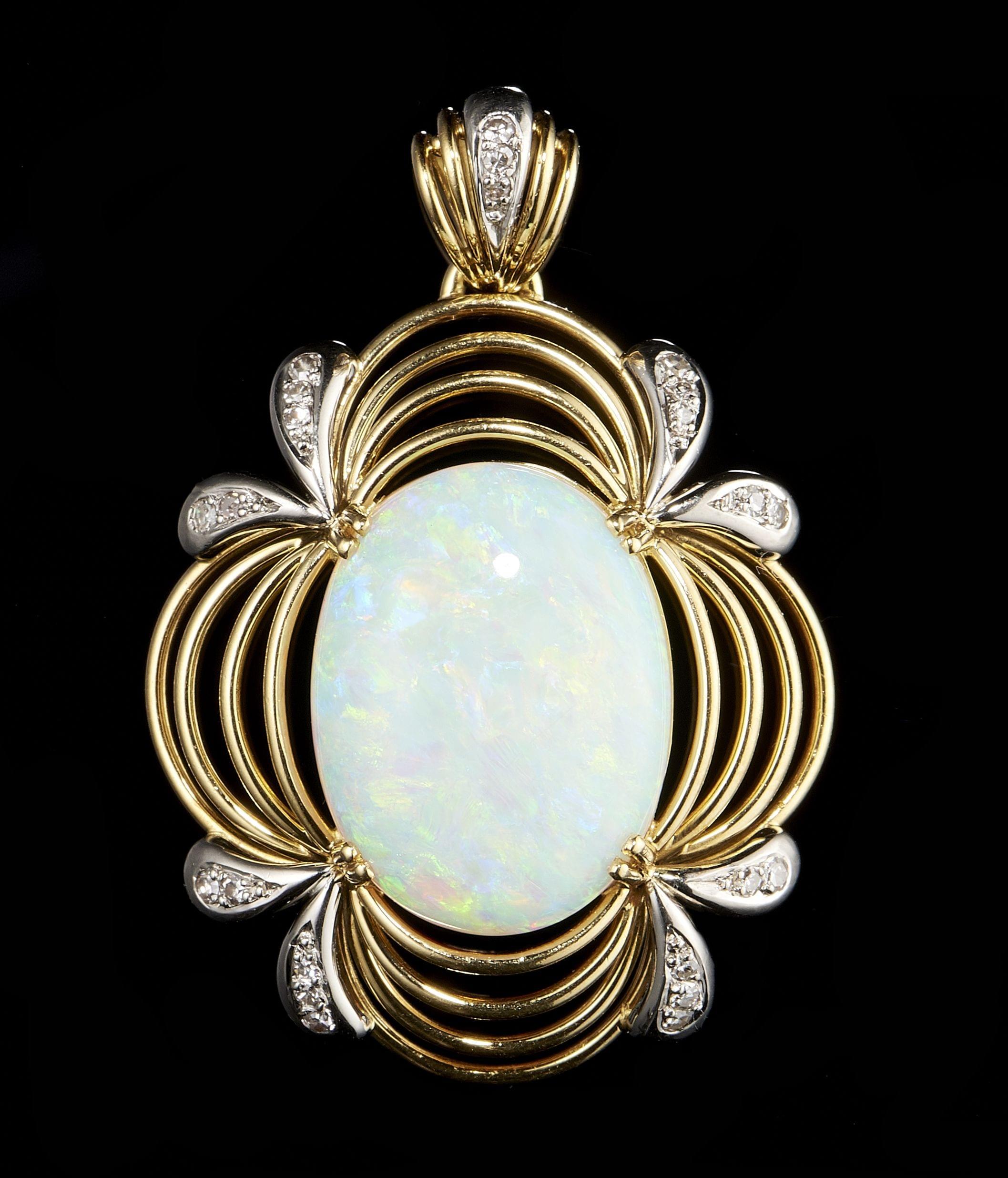 68. Pendentif ajouré centré d'une opale ovale à fond blanc rehaussée de petits diamants