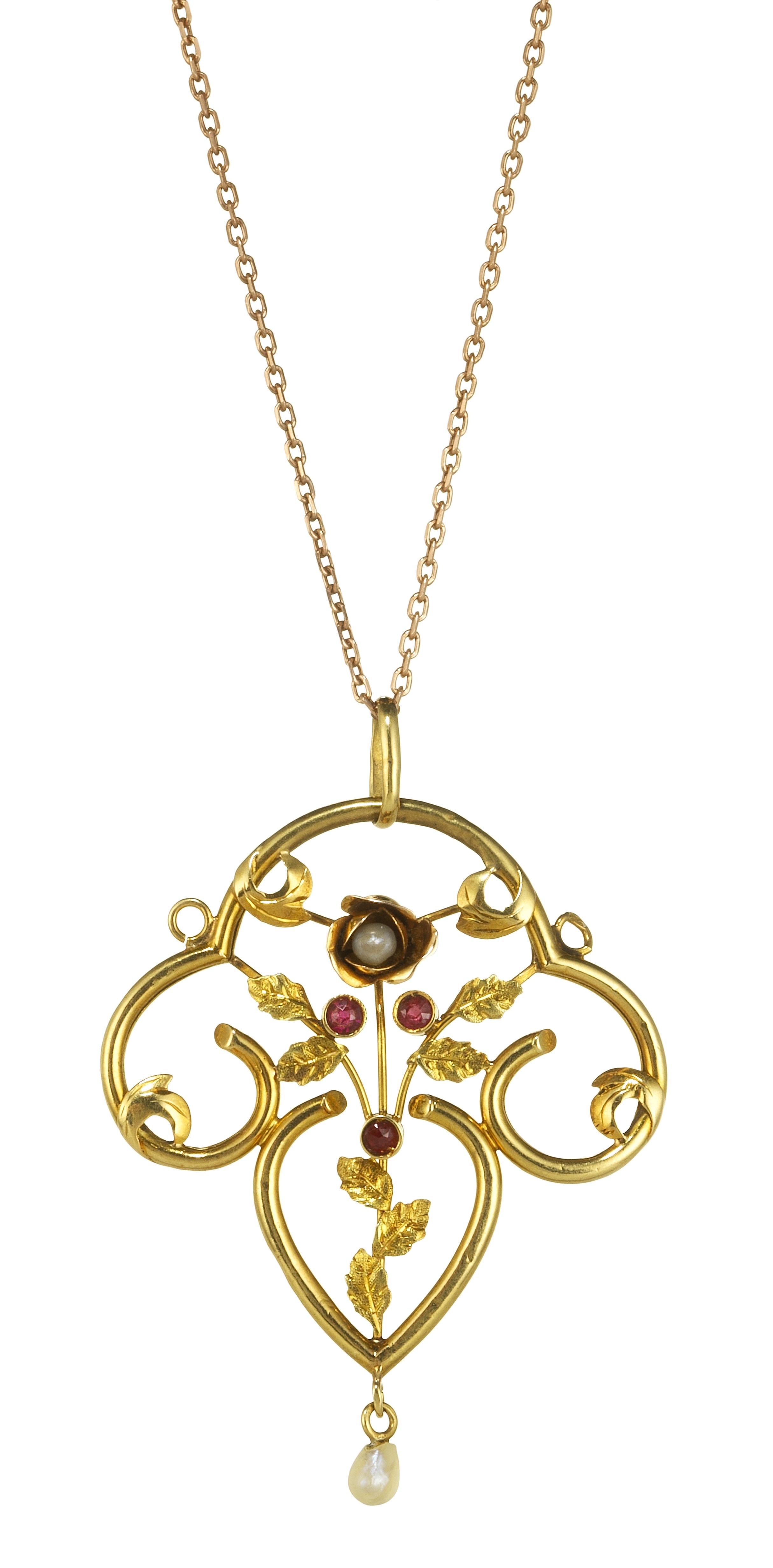 3155. *Pendentif Art nouveau ajouré à motifs feuillagés serti de pierres d'imitation pour le rubis et de perlettes