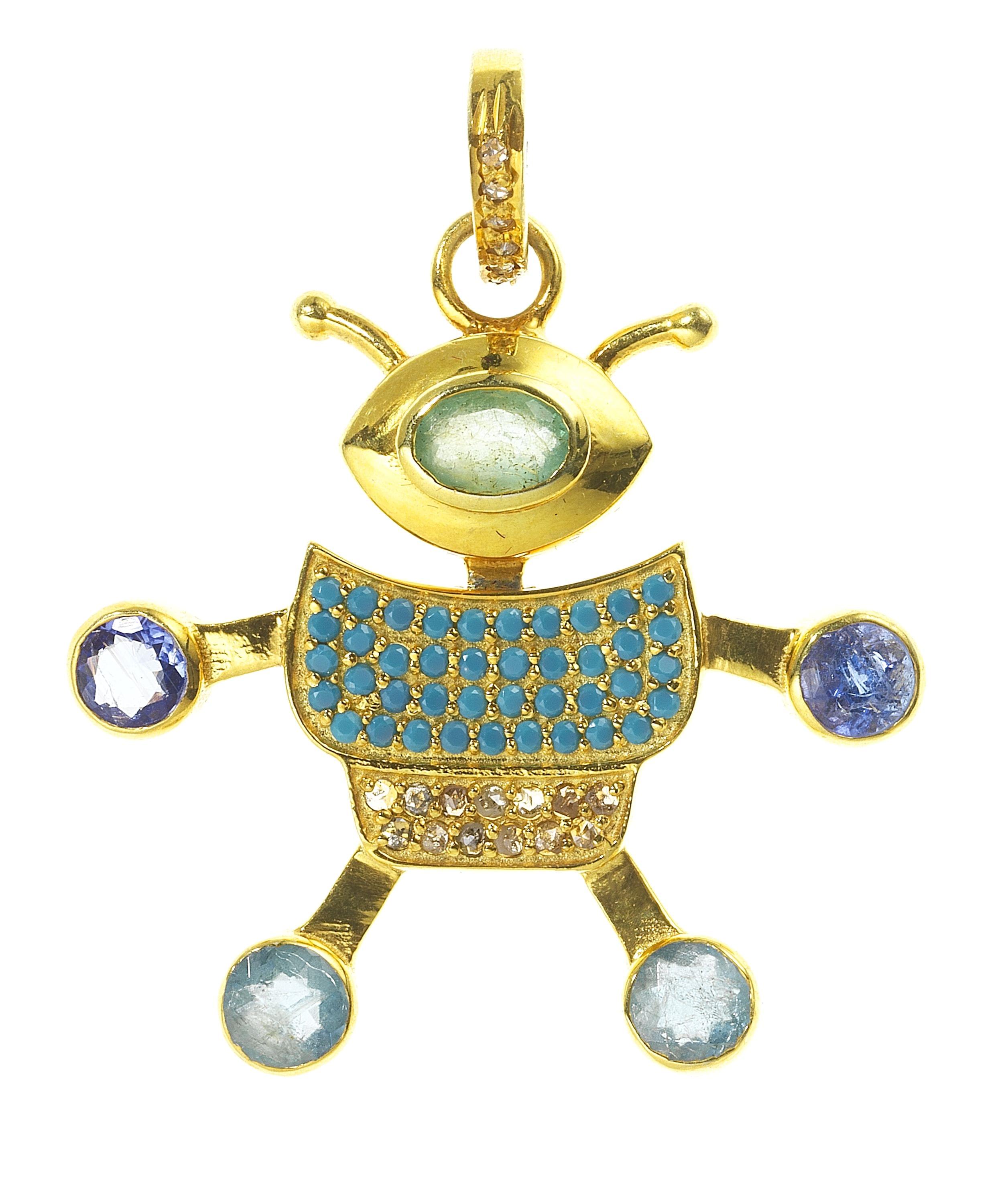3117. *Pendentif articulé à motif de petit robot serti de saphirs, d'émeraudes, de turquoises et de roses de diamant