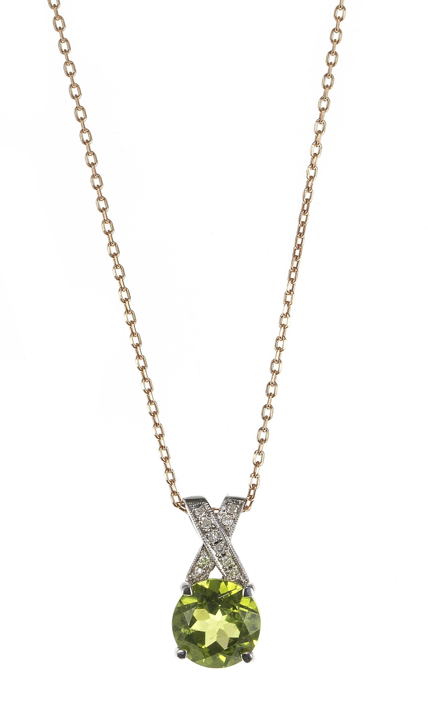 3192. *Pendentif centré d'un péridot taille brillant (env. 1,7 ct) rehaussé d'un motif de croix sertie de diamants