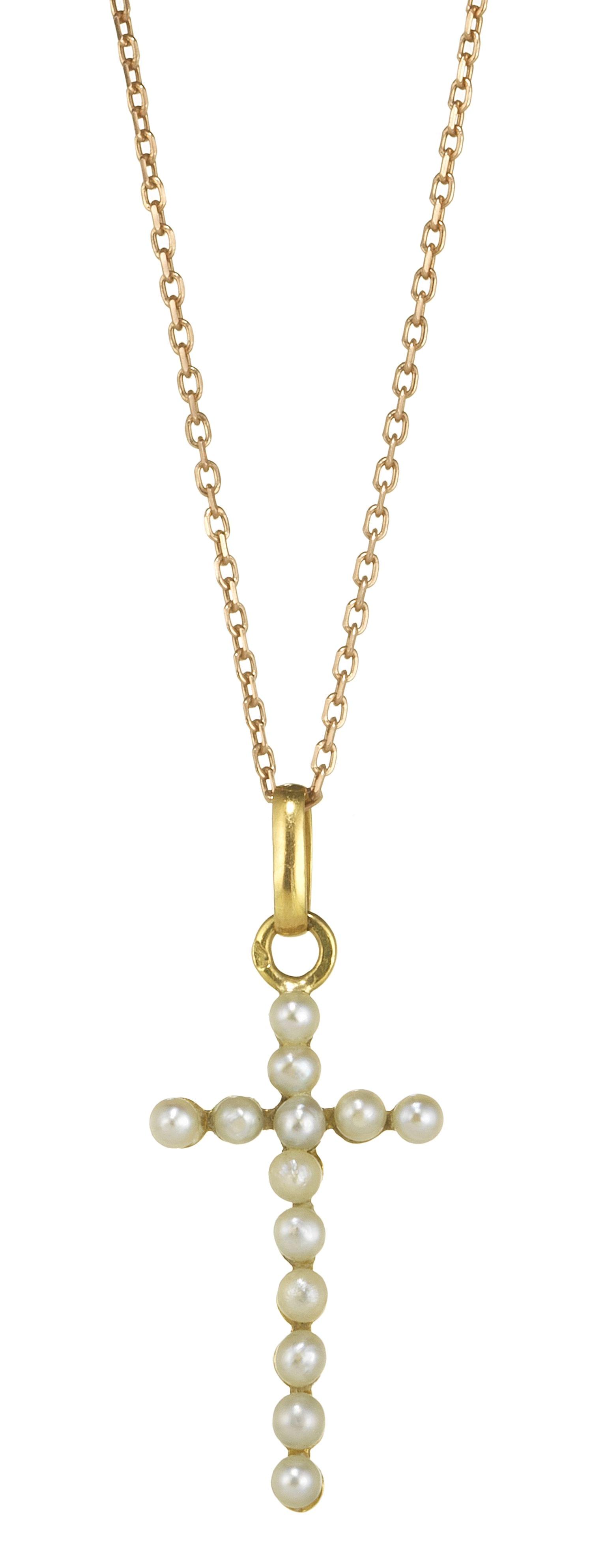 3330. *Pendentif croix entièrement serti de demi-perles probablement fines