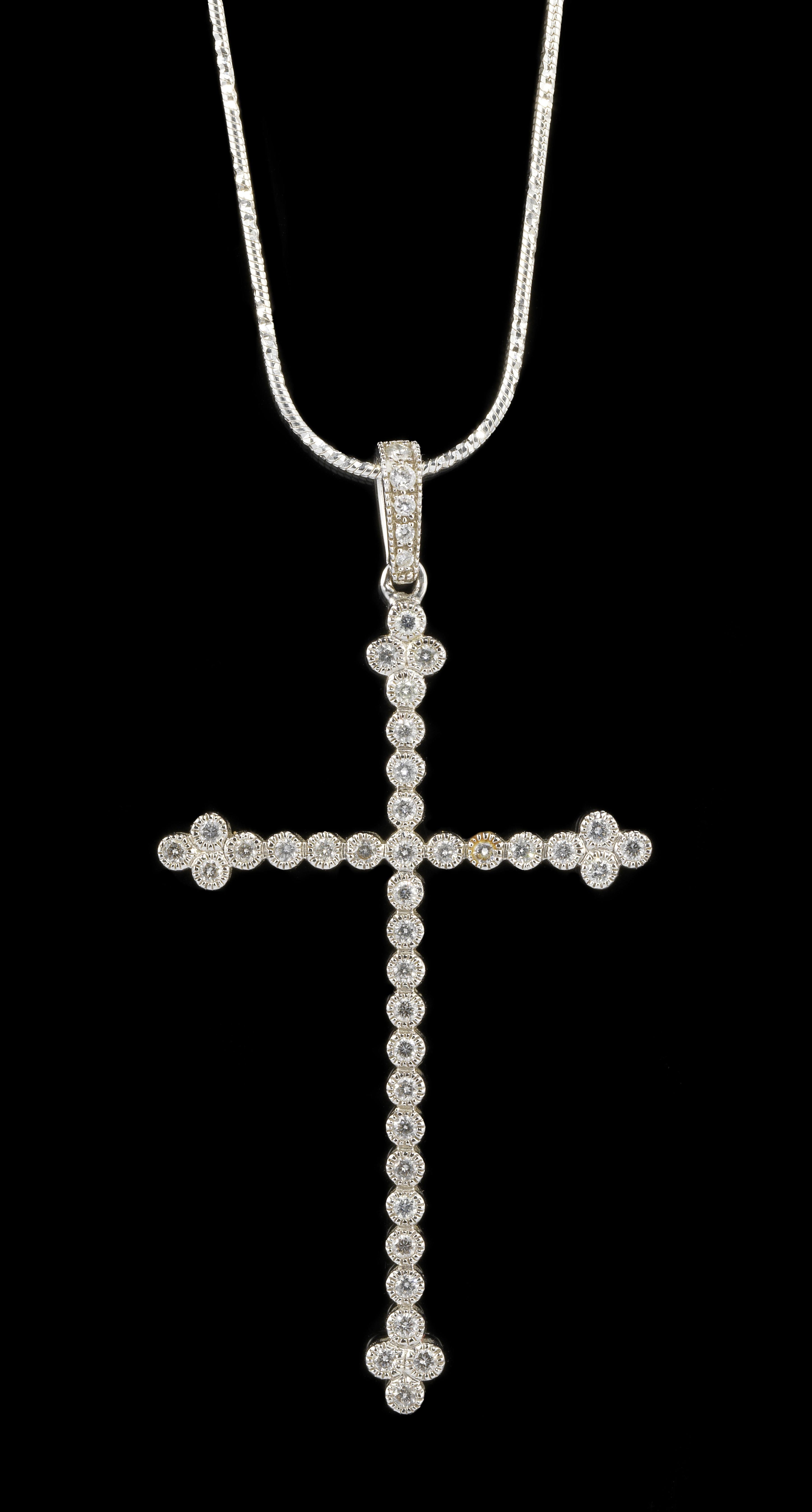 Or gris 750, H 5,5 cm, 4 g. On joint une chaîne en argent 925, L 40 cm. Pour les lots précédés d'un *, la TVA de 7,7% est due sur l'entier du prix d'adjudication.
