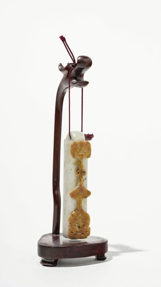 Jade bicolore sculpté d'un motif en relief, L 8 cm