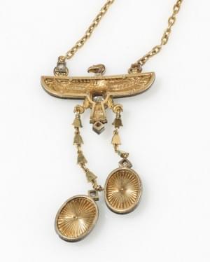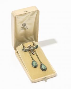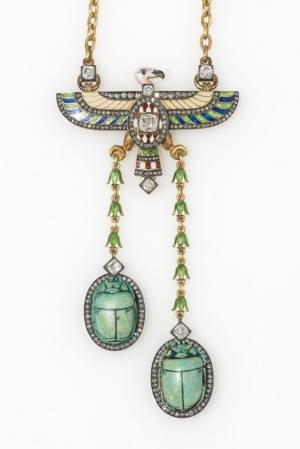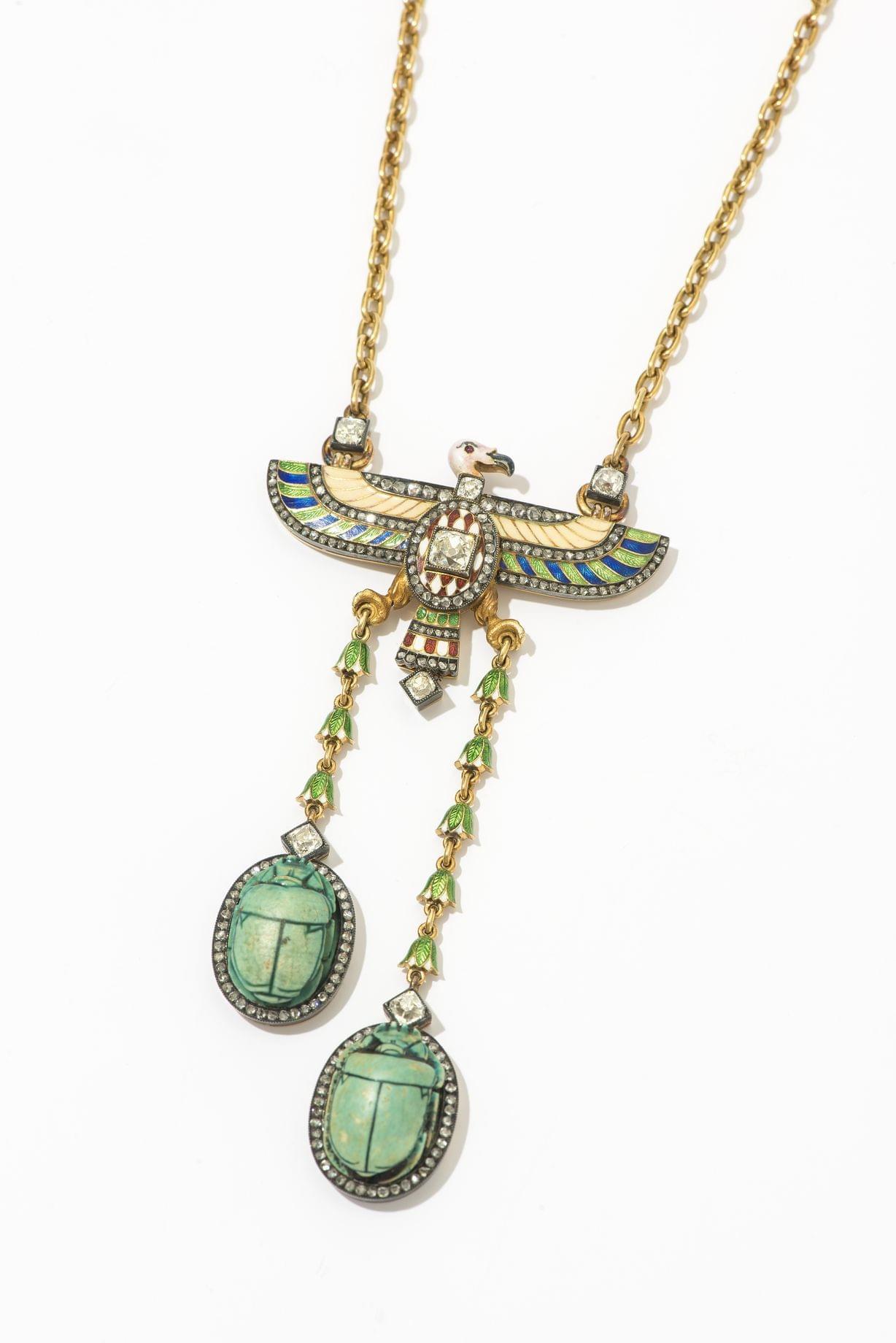 Pendentif de style retour d’Egypte à motif de faucon émaillé et serti de diamants, retenant deux scarabées turquoise antiques en neglige K. Fabergé, chef d'atelier Henrik Wigström, Saint-Petersbourg, 1908-1917, 72 zolotniks, or 750, 50 g