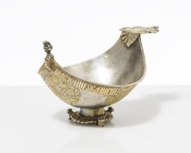 73. Petit kovsh sur pied ou Korchik de forme navette à décor de rinc...