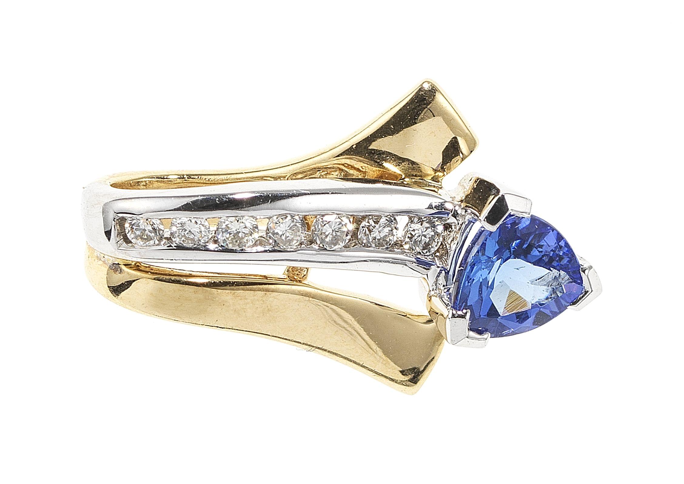 3136. Pendentif deux ors serti d'une tanzanite taille troïda rehaussée d'une ligne de diamants