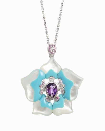 147. Pendentif fleur en nacre turquoise sertie d'une améthyste entourée de rubis et diamants, avec sa chaîne