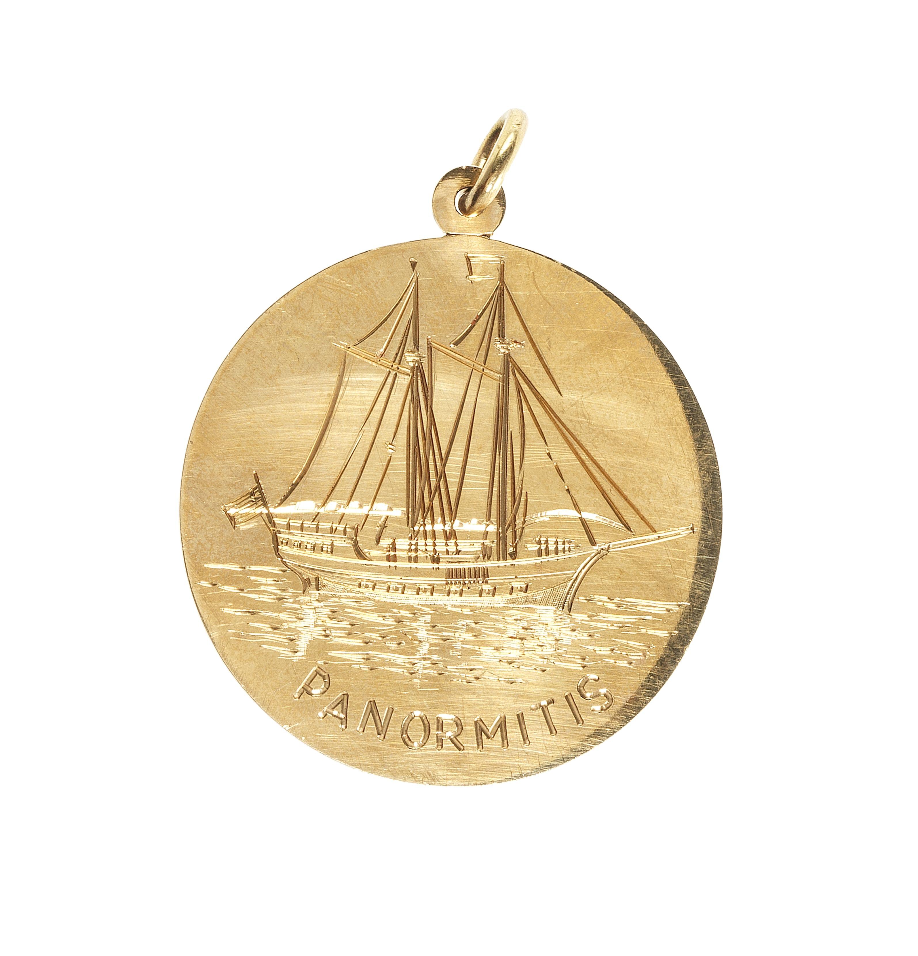 3351. Pendentif Panormitis gravé d'un navire et daté du 16 juin 1962