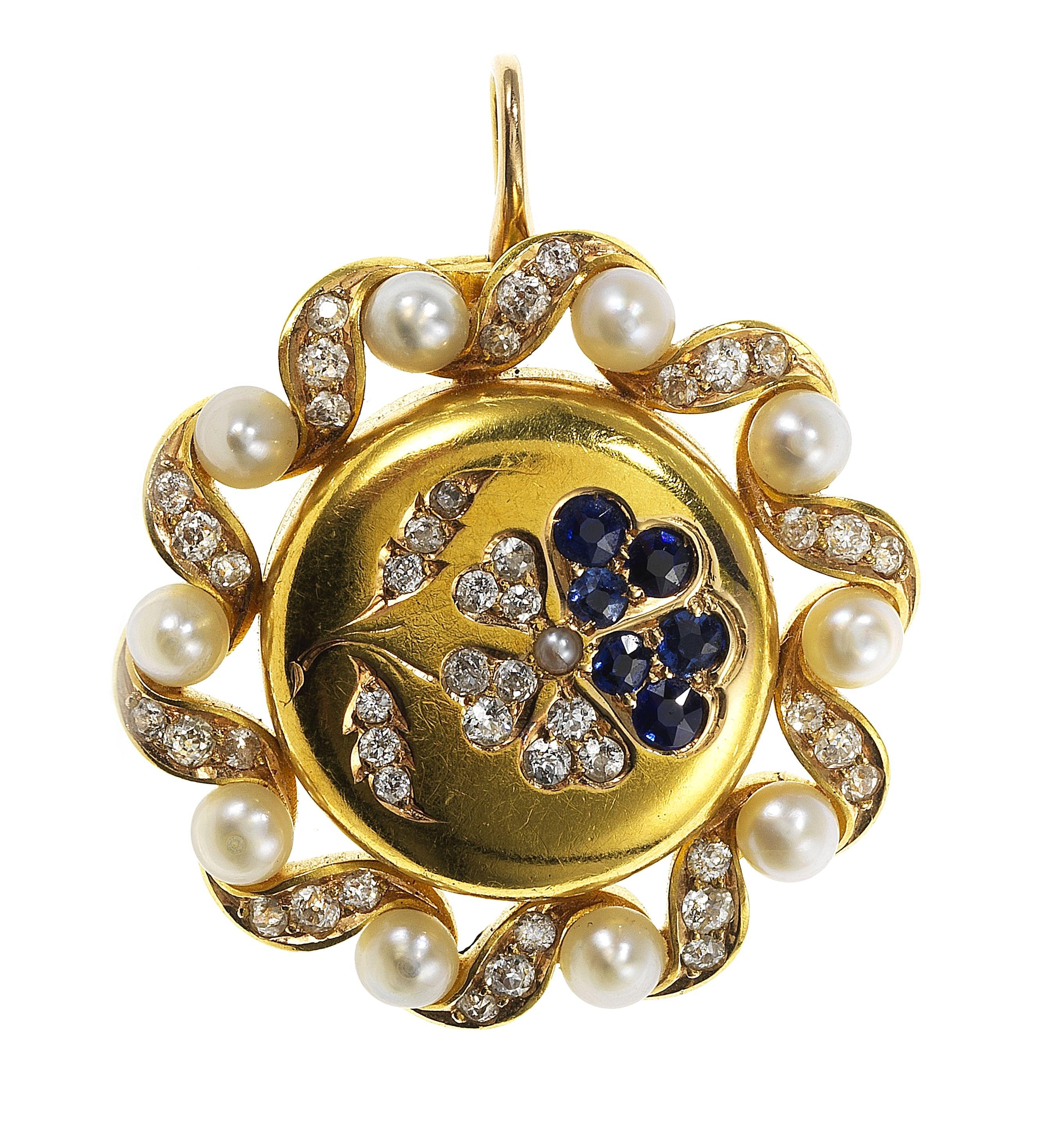 3340. Pendentif porte-photo entouré de perles à motif floral serti de diamants et de saphirs