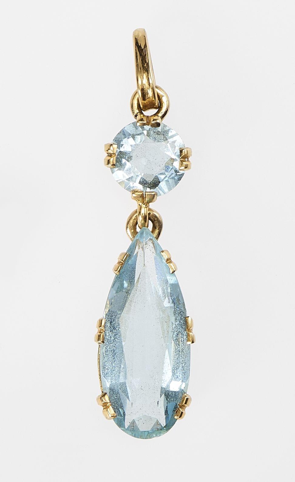 3461. Pendentif retenant une aigue-marine taille poire (env. 4 ct) surmontée d'une aigue-marine taille brillant (env. 1 ct)