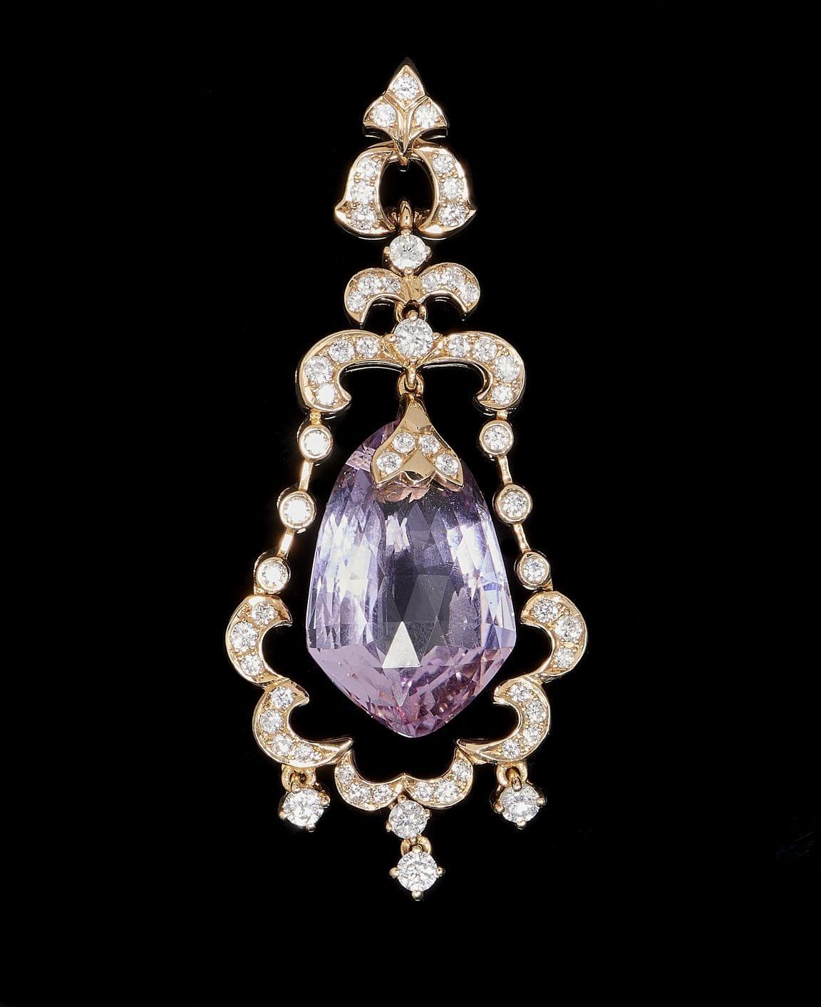 132. Pendentif retenant une améthyste taille fantaisie facettée rehaussée de diamants