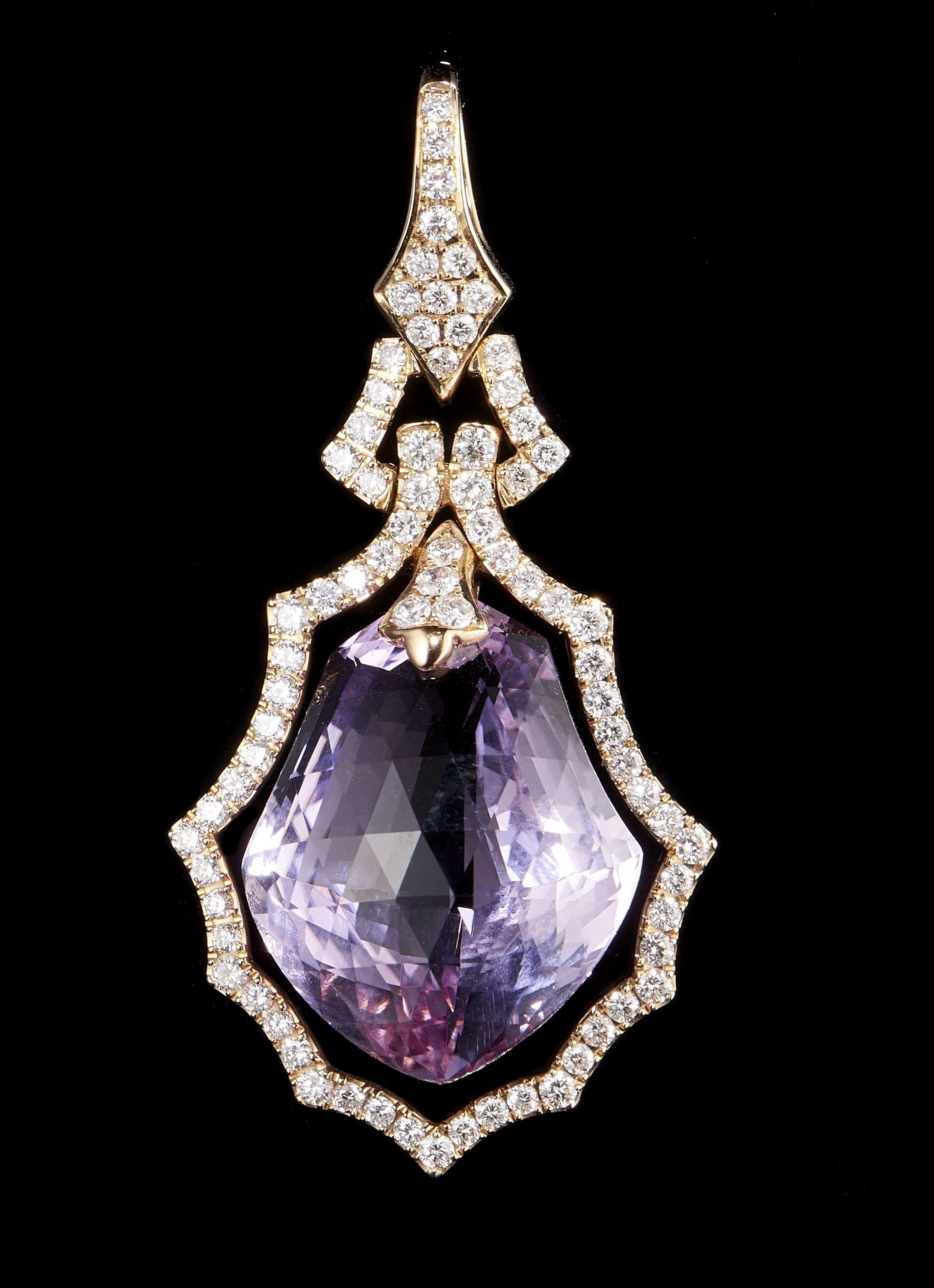 83. Pendentif retenant une améthyste taille fantaisie facettée (env. 17 ct) rehaussée de diamants (env. 1 ct)