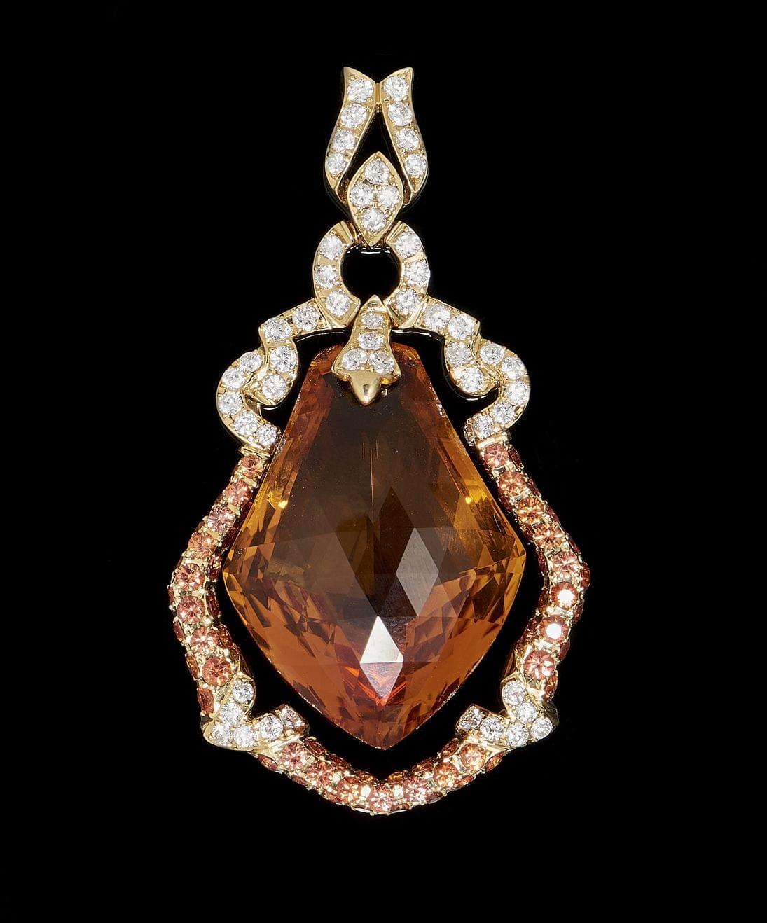 125. Pendentif retenant une citrine taille fantaisie facettée entourée de saphirs orange et de diamants