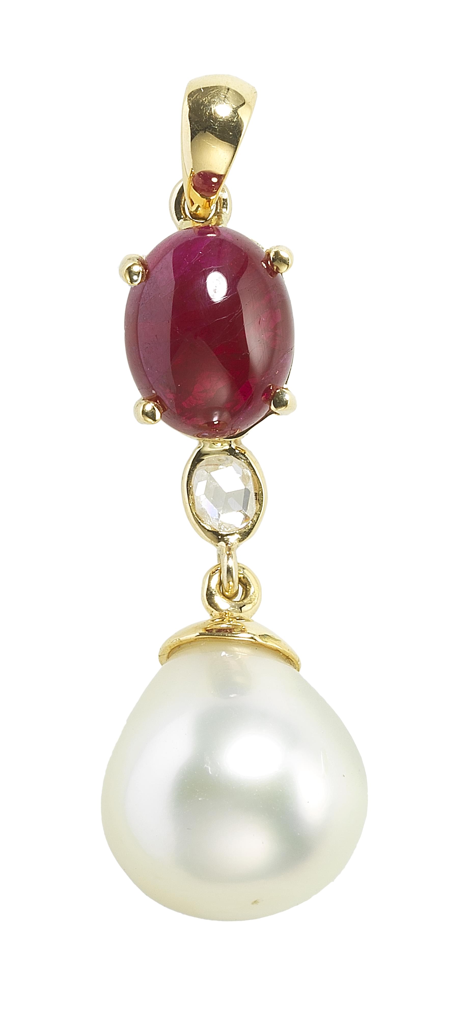 Rehaussée d'un rubis taille cabochon ovale (env. 2,5 ct) et d'un diamant taille rose, or 750, L 3,5 cm, poids brut 3 g