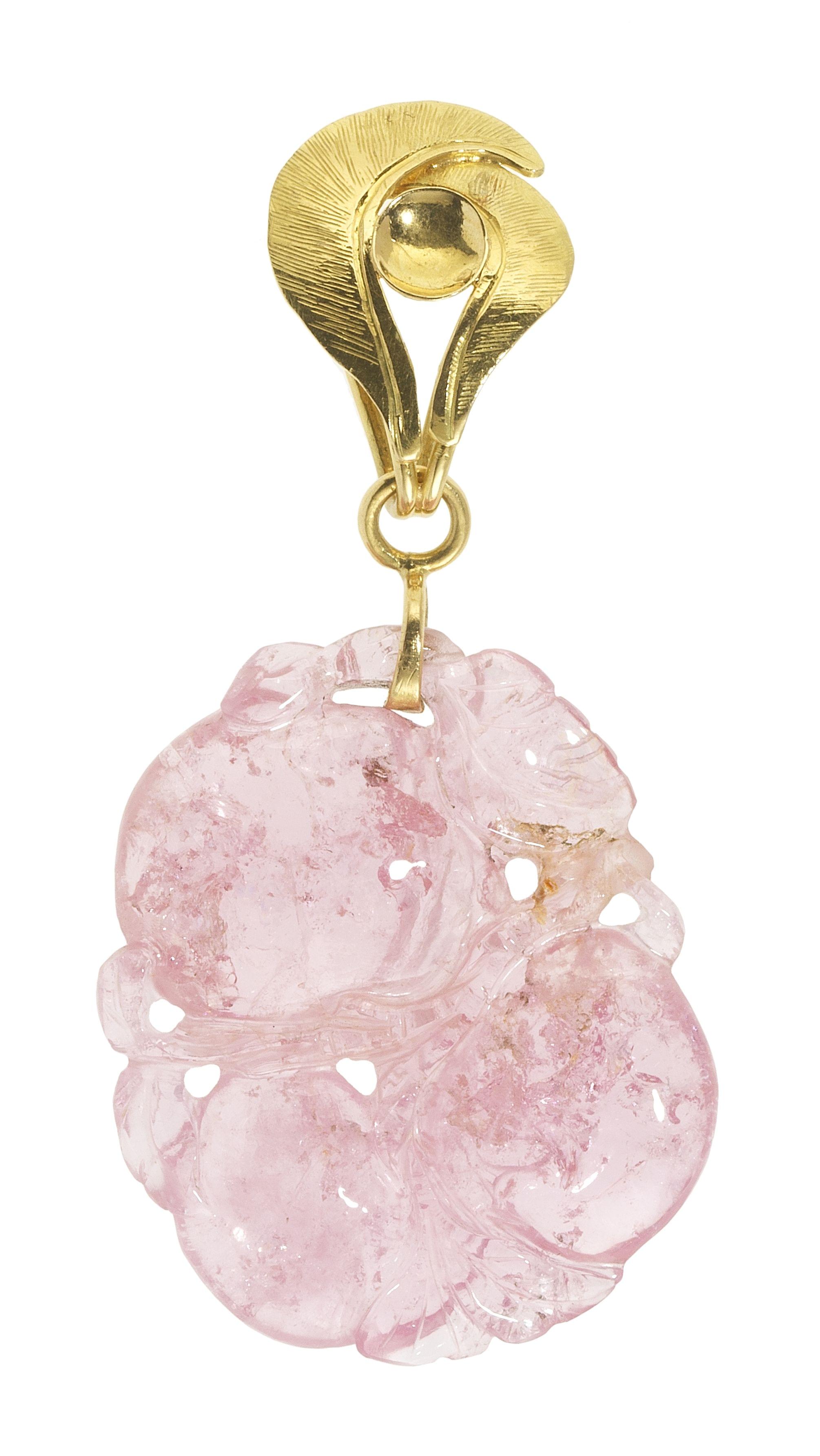 3036. Pendentif retenant une tourmaline rose sculptée à décor de pêches