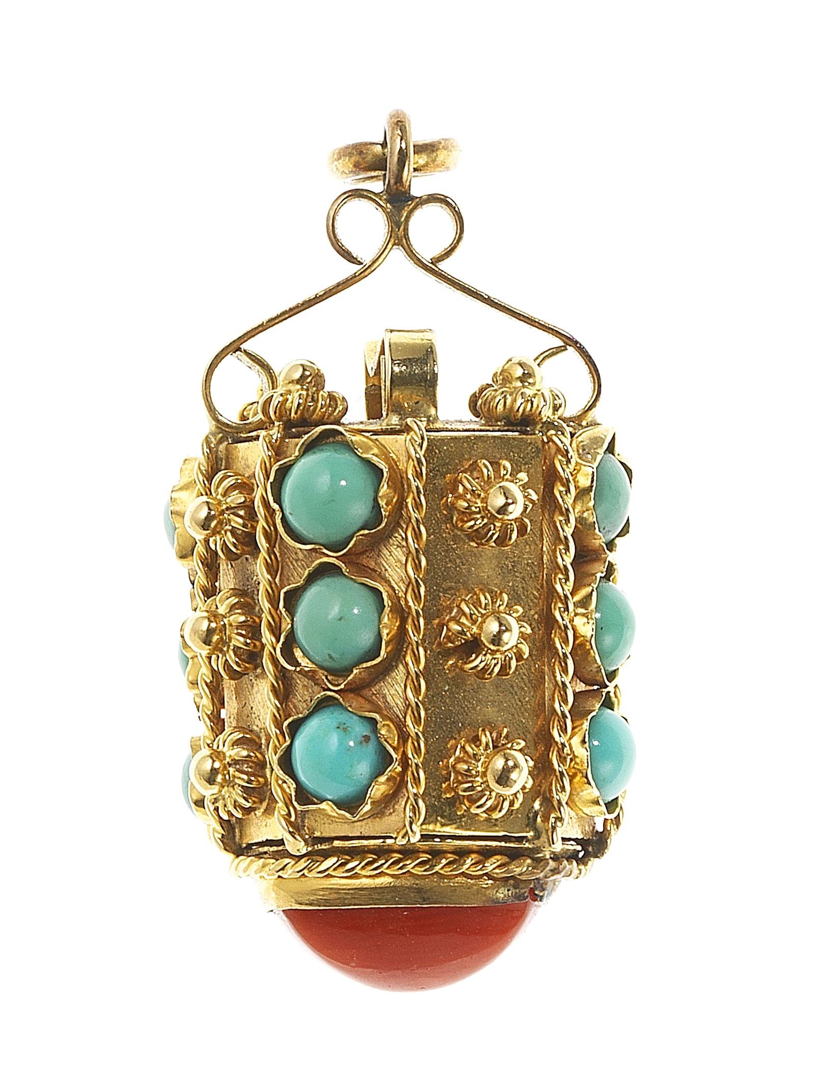 3164. Pendentif serti d'un corail taille cabochon rehaussée de turquoises taille cabochon