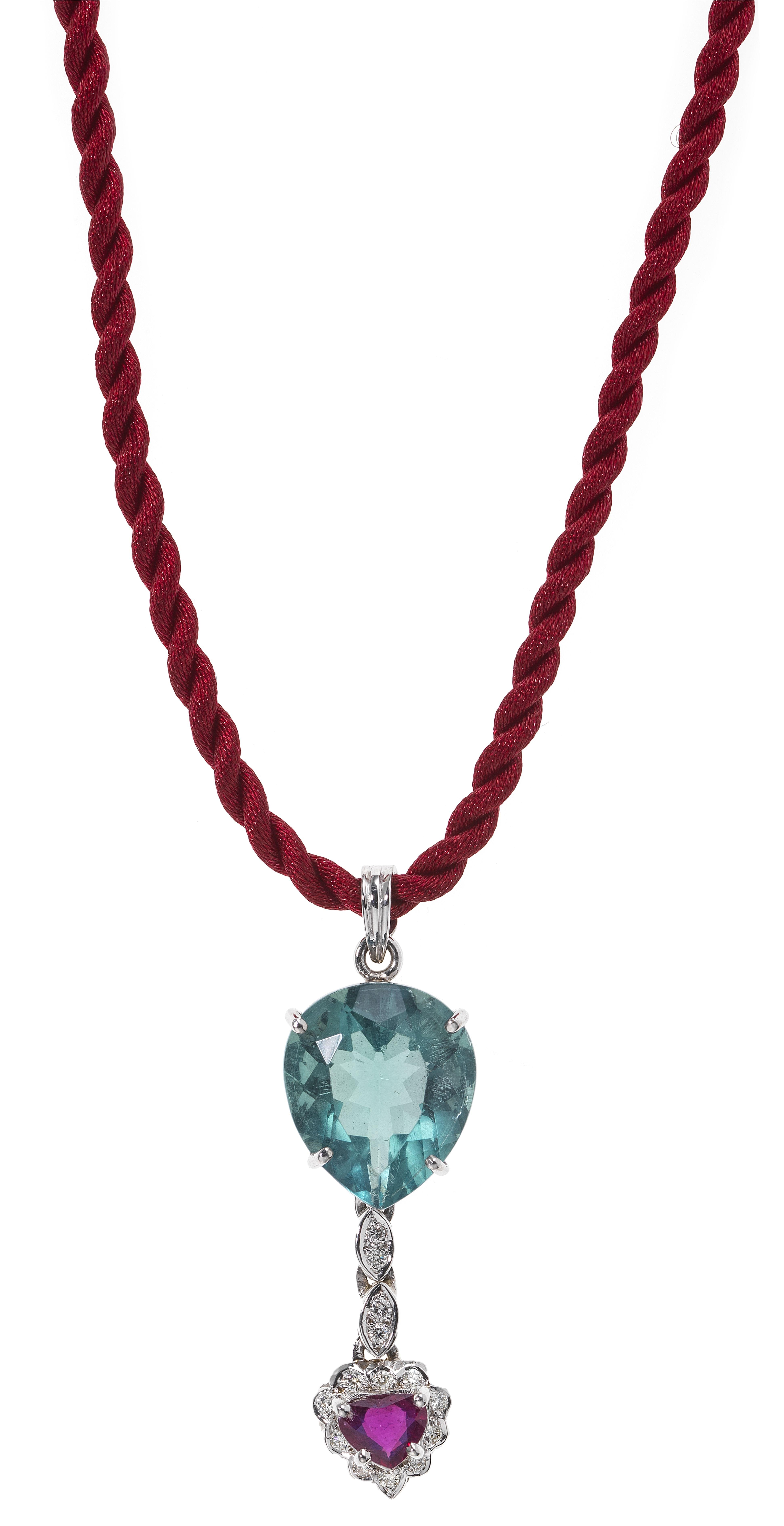 3394. *Pendentif serti d'un quartz bleu vert taille poire retenant un rubis taille cœur entouré et rehaussé de diamants
