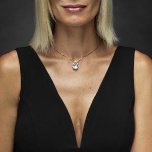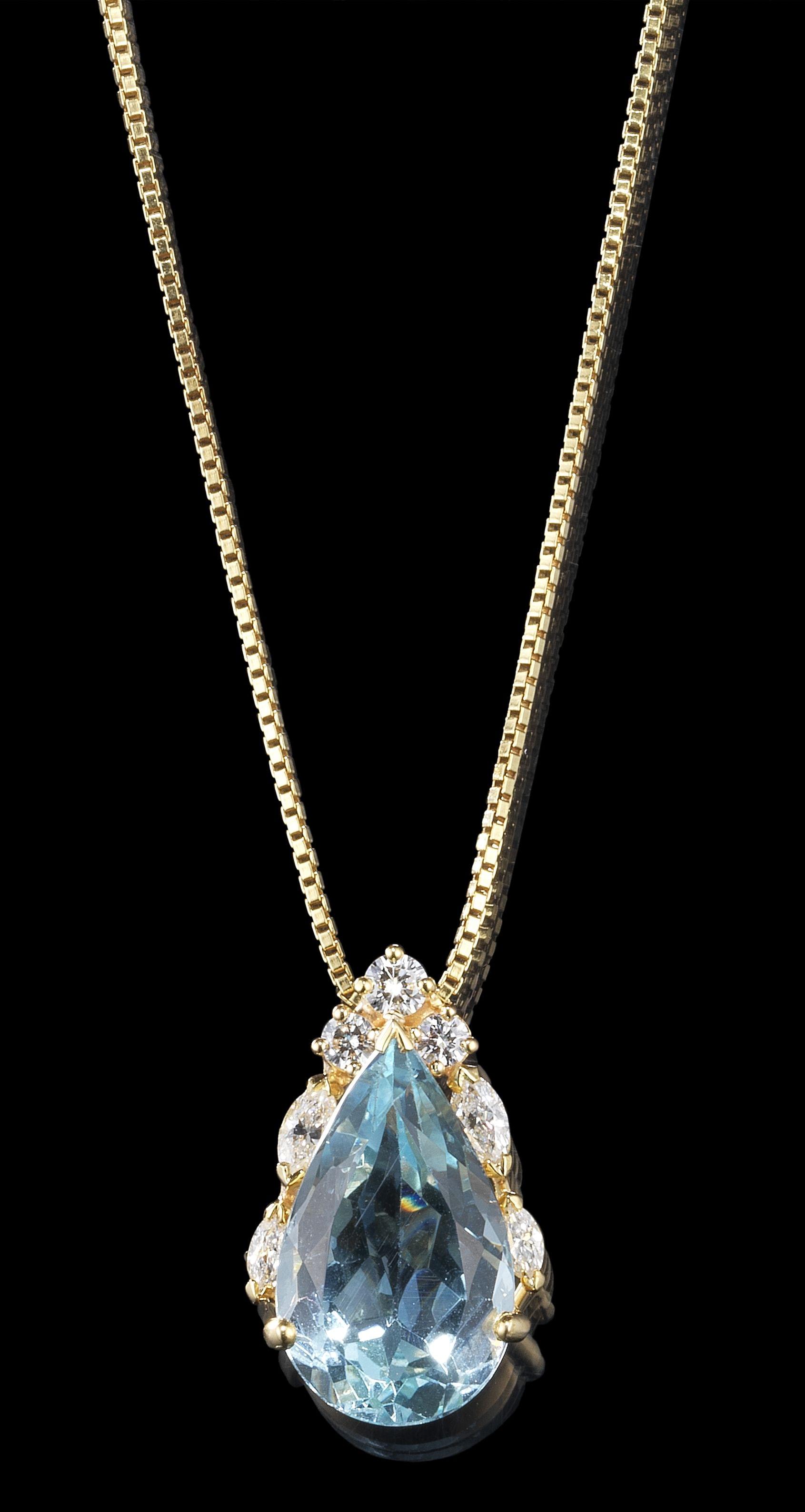 181. Pendentif serti d'une aigue-marine taille poire (env. 8 ct) rehaussée de diamants taille marquise et brillant, retenu par une chaîne à