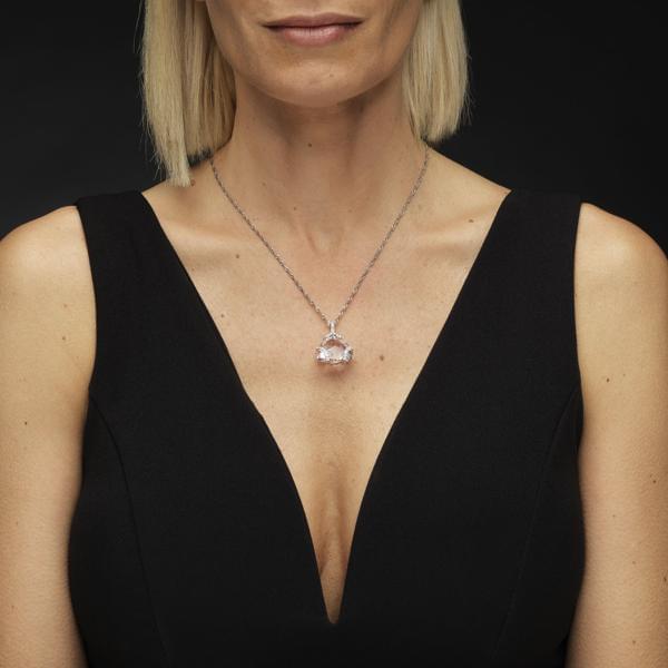 177. *Pendentif serti d'une morganite taille fantaisie (23,01 ct) rehaussée de lignes de diamants (env. 0,5 ct), retenu par une chaîne à maille