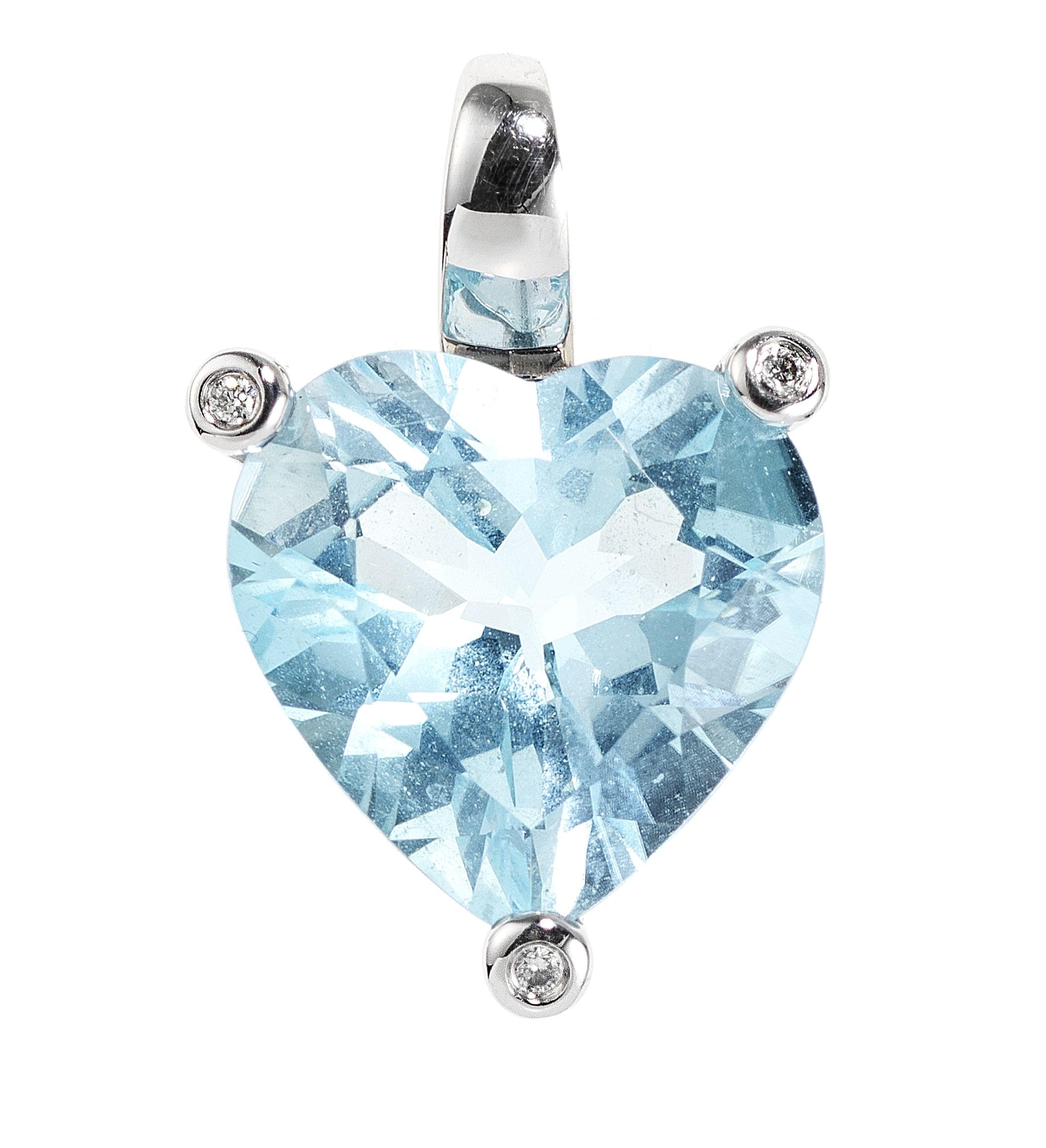 3273. Pendentif serti d'une topaze bleue taille cœur (env. 11,5x13 mm) rehaussée de trois diamants