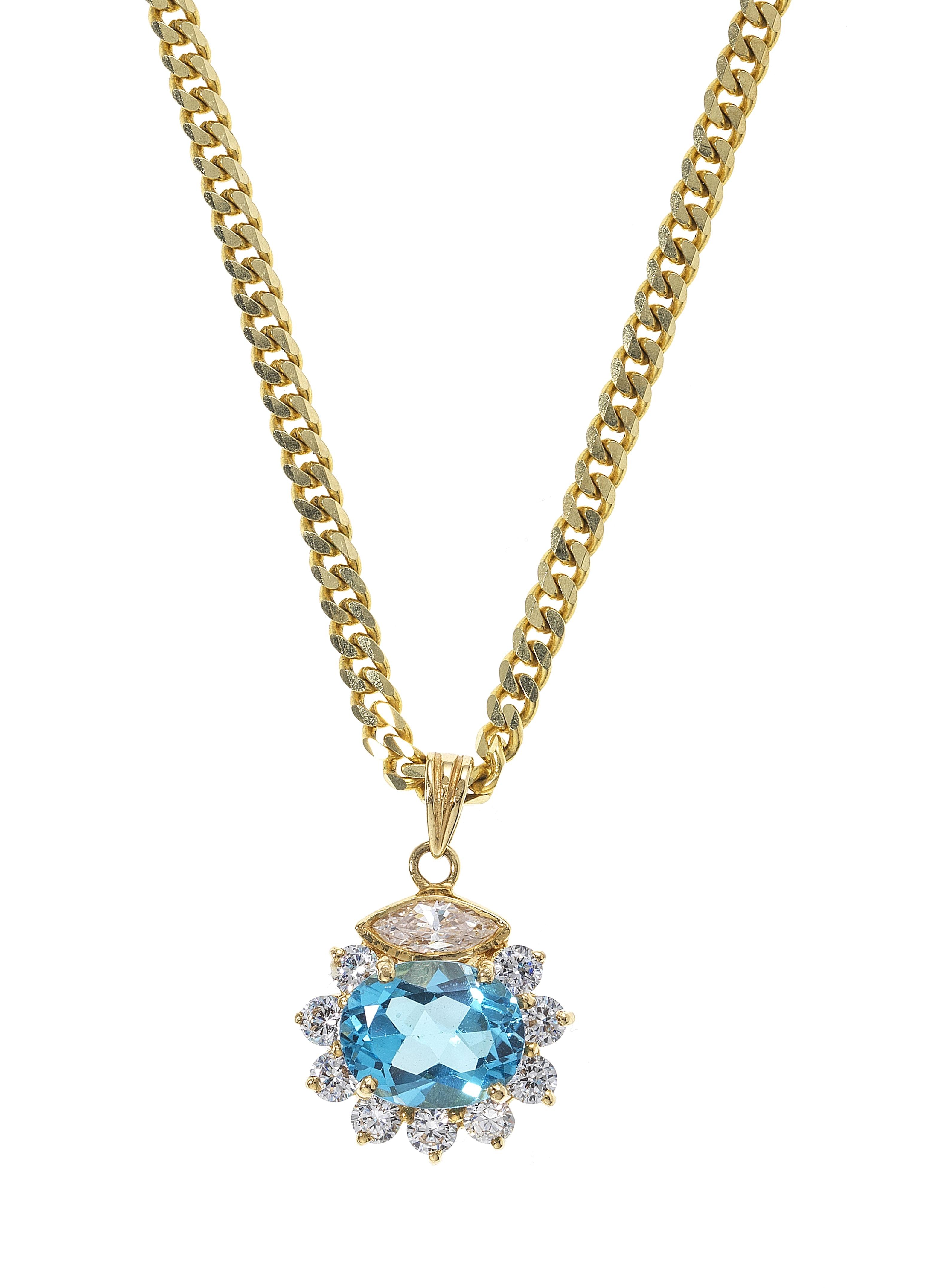3340. Pendentif serti d'une topaze bleue taille ovale (env.2,8 ct) entourée de pierres d'imitation pour le diamant retenu par une chaîne à maille