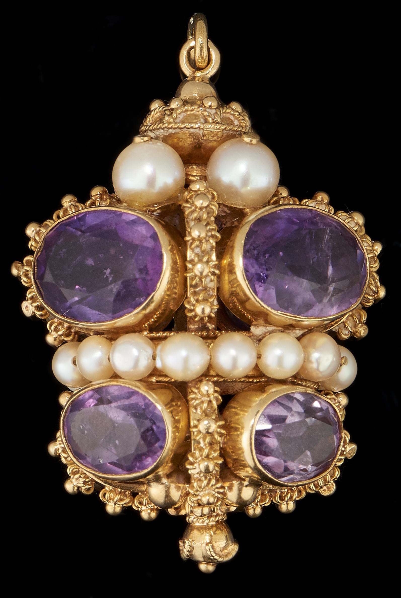 963. Broche sertie d'une améthyste taille brillant (env. 30 ct) entou...